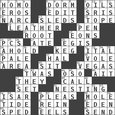 ACROSS 1. Like (prefix) 5. Dormintory (informal) 9. Lubricates 13. Greek god of love 14. Prepare for publication 15. Indian titles of respect 16. Drug cop 17. Bobsleighs 18. Drink excessively 19. Cordwainer's material 21. Writing instrument 22. Carrot, for example 23. Immeasurably long periods of time 24. Personal Computers (abbr.) 27. Had dinner 28. The front part of a cuirass 29. Hold, grip (Informal) 31. Barrel 32. Slanted text style (abbr.) 36. Diluted with white 37. Actor Linden 38. Grand slam 39. Type of rug 40. Be seated 41. Viva Las _ 42. It was, poetically 44. Bear (Spanish) 46. Small island 47. Those people 48. Give a ring to 50. Arrange properly for use 51. Nestling 54. Austrian river, tributary to the Danube 56. Entreaties 58. Undercover agent 60. Event that recurs at intervals 61. It's straight from the horse's mouth 62. Paradise 63. Broke a traffic law 64. Snakelike fish 65. Transmit DOWN 1. Layer 2. Taken by mouth 3. Greater amount 4. Motion picture award 5. Erase 6. Baltic tributary 7. To free from 8. Mountains (abbr.) 9. Clearly or manifestly demonstrative 10. Metal shackles 11. Mouth edge 12. Compass dir. 17. Opportunity 20. Frog relative 21. Luau course 23. Ovum 24. Dad 25. Burn to charcoal 26. Not divided or shared with others 28. Snakelike fish 30. Resembling or made to resemble leather 31. Krazy ___ of comics 33. Ancient Roman robe 34. Mountain range southwest of Kyrgyzstan 35. For fear that 37. Part of HMS, perhaps 40. Declare 41. Electrical Unit 43. Soggy 44. Seas 45. Backtalk 47. Sadhe (variant) 49. Citrus fruits 51. Famous astronaut Armstrong 52. Connecting point 53. Small, secluded valley 54. ___ a Wonderful Life 55. Small drink 56. Before (prefix) 57. Area sheltered from the wind 59. Conclusion