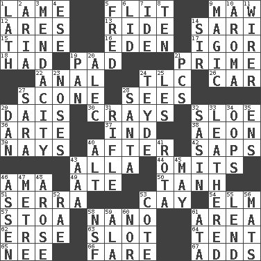 ACROSS 1. Unable to walk 5. Sudden quick movement 9. Opening into something insatiable 12. Ancient Greek god of war 13. Travel on or in a vehicle 14. Indian skirt 15. Prong on a fork 16. Paradise 17. Russian composer Stravinsky 18. Possessed 19. Groovy apt. 21. First class 22. Of or related to the anus 24. Affectionate concern, for short 26. Auto 27. Biscuitlike quick bread 28. Observes 29. Raised platform 30. Trading vessels 32. A type of plum 36. Johnson of "Laugh-In" 37. Working for oneself (abbr.) 38. A really long time 39. Negative votes 40. Following 42. Plant excrements 43. Silent film actress Nazimova 44. Leaves out 46. Housemaid (var.) 49. Had dinner 50. Hyperbolic tangent 51. Father Junipero _ 53. Island 54. Shade tree 57. Portico 58. Billionth: prefix 61. Type of rug 62. Celtic language 63. Notch 64. Portable shelter 65. Born 66. Conductor's collection 67. Sums up DOWN 1. Thin strip of wood or metal 2. Roberta Peters solo 3. Ananias' fault 4. Compass dir. 5. Flintstone 6. Flaplike covering 7. Binary compound 8. Nine, plus one 9. Mysterious quality of enchantment 10. Scent 11. One who wires 14. Title for a knight 19. Baking dish 20. Actor Baldwin 21. Personal Computers (abbr.) 23. Olfactory organs 24. Miss Universe 1986, Barbara Palacios _ 25. French article 27. "Two Mules for Sister ____" 28. Before Barbara or Clara 29. Daniel's nick name 31. Ransack; plunder; pillage 32. Indian antelope 33. Resembling or made to resemble leather 34. I made a mistake 35. Followers of ems 40. The first octave above the treble staff 41. Roll call or roster of names 43. American Automobile Association (abbr.) 45. Fifth month 46. NE Netherlands city 47. Distance measurement (Brit.) 48. Came up 52. Actress Charlotte 53. ____ d'Azur (French Riviera) 55. Grant temporary use of 56. Floor coverings 58. Overdraft (abbr.) 59. Wing 60. Not either 61. "One Day ___ Time"