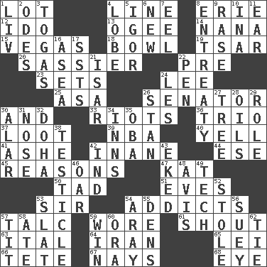 ACROSS 1. Car dealer's back yard 4. Actor's bit 8. One of the Great Lakes 12. Wedding promise 13. Double curve, resembling the letter S 14. Grandmother 15. Viva Las _ 18. Soup holder 19. Russian ruler of old 20. More lively and spirited 22. Before (prefix) 23. Arranges properly for use 24. Area sheltered from the wind 25. White ___ sheet 26. Elected representative 30. Also 33. Disturbances 36. Musical group of three 37. Plunder 39. Basketball assoc. 40. Shout 41. American tennis player Robert 42. Silly 44. Compass dir. 45. Thinks logically 47. Krazy ___ of comics 50. Small amount or degree 51. Nights before holidays 53. Title for a knight 54. Inveterate users 57. Baby powder 59. Had on 61. Yell 63. Slanted text style (abbr.) 64. SW Asia republic 65. Luau accessory 66. Wig 67. Negative votes 68. Sight organ DOWN 1. 54 in ancient Rome 2. Lyric poems 3. Ancient Roman robes 4. Ear part 5. Russian composer Stravinsky 6. ___ Haven, CT 7. Snakelike fish 8. Plea 9. To erase 10. _ tizzy (2 wds.) 11. Ewer handle 16. Toward the sea 17. Fast planes 21. Austrian river, tributary to the Danube 22. Writing instrument 24. French article 26. Comedian Laurel of Laurel & Hardy 27. Relationship diagram 28. Lubricates 29. Hero or heavy, e.g. 30. Having or resembling wings 31. Olfactory organ 32. Capital of the state of Qatar 34. Restaurants 35. Chief or king in Benin or Nigeria 38. A testis 42. Indiana (abbr.) 43. Made supply last 46. Boat paddle 48. Deliberation 49. Technology 52. Took without asking 53. Narrow board 54. Like ___ of sunshine 55. Cub Scout units 56. Chop _ 57. Teat (slang) 58. Had dinner 59. Acquire through effort 60. Mouth or opening 62. Neckwear