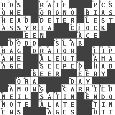 ACROSS 1. Two (Sp.) 4. Pace 8. Personal Computers (abbr.) 11. Single 12. U. of Maine site 14. Prejudice 15. Froth on beer 17. Prevent from occurring 18. For fear that 19. Nineveh was its capital 21. Timepiece 23. Car or cant ending 24. Adept person 25. Texas town _ City 27. Broad, flat, thick piece 30. Container for groceries 31. Speaker 34. Mouth edge 37. One (Scot) 38. Eskimo relative 39. Wet nurse (var.) 40. Personal question 41. Oozed 43. Possessed 44. Fermented drink made from hops 45. Suggestive of the supernatural 47. Mouth or opening 49. 24 hours 50. Amid 52. Borne 56. Famous astronaut Armstrong 57. Smooth fabric 60. Inside; within (prefix) 61. Make mention of 62. Having winglike extensions 63. Metal container 64. Followers of ems 65. Ripens 66. Baseball player Mel DOWN 1. Capital of the state of Qatar 2. Singles 3. Oceans 4. "The Thinker" sculptor 5. Type of rug 6. Small child 7. Compass dir. 8. Component 9. Keg 10. Fast jet (abbr.) 13. The grampus (Milton) 14. Group of countries in special alliance 16. Colored 20. Do over again 22. Experiment locale 25. Mild oath, euphamism for damn 26. Double curve, resembling the letter S 27. Navigate 28. Central Nebraska county 29. Johnson of "Laugh-In" 30. Sound made by sheep 32. To erase 33. Toward shelter 34. Cowardly lion portrayer 35. "If ____ say so..." 36. Writing tablet 42. Letter starter 44. Prohibit 46. Jane of fiction 47. Leaves out 48. Hero or heavy, e.g. 49. Natives or inhabitants of Denmark 50. A really long time 51. Girls' org. (abbr.) 52. Quote 53. To the inside or interior of 54. Prepare for publication 55. Do not 56. Compass dir. 58. According to 59. Label