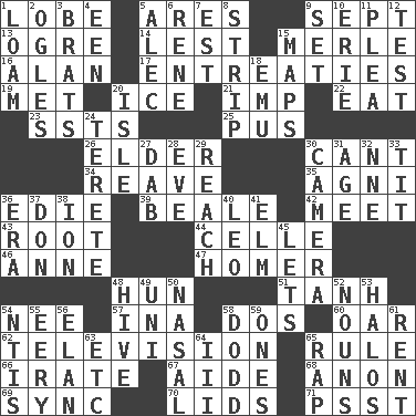 ACROSS 1. Ear part 5. Ancient Greek god of war 9. Back-to-school mo. 13. Legendary monster 14. For fear that 15. Haggard of country music 16. Actor Alda or Thicke 17. Pleas 19. Was introduced to 20. Frozen water 21. Mischievous child 22. Ingest 23. Fast planes 25. Tenth month of the Hindu calendar 26. A person who is older than you are 30. Patter 34. Rob, plunder, or pillage 35. Hindu god of fire 36. Singer Brickell 39. Calif. Air Force Base 42. Confront 43. Carrot, for example 44. Cell (Danish) 46. Queen of England 1702-14 47. Baseball hit which scores a run 48. Attila the _ 51. Hyperbolic tangent 54. Born 57. _ tizzy (2 wds.) 58. Two (Sp.) 60. Boat paddle 62. Household entertainment appliance 65. General guideline 66. Feeling or showing extreme anger 67. Helper 68. At once, immediately (arch.) 69. Synchronize (abbr.) 70. Hats (slang) 71. Inconspicuous attention getter DOWN 1. Rich soil 2. Stares 3. Naughty children 4. Car or cant ending 5. Actor Baldwin 6. French philosopher Descartes 7. Eastern Standard Time (abbr.) 8. Long narrow piece of something 9. Arrange properly for use 10. 4th largest of the Great Lakes 11. Entreaty 12. Trial 15. Atlas contents 18. Australian flightless bird 20. Small island 24. Cigar-shaped 27. Small moist lump or mass 28. Night before a holiday 29. Arrive at 30. Device for capturing images 31. Ripen 32. Compass dir. 33. Teat (slang) 36. Epoch 37. Spanish title 38. Electrically charged atom 40. Lion 41. Shade tree 45. Allows 48. Hub of activity 49. University (slang) 50. Rhinal 52. Parts of speech 53. Saint headwear 54. Nuclear Threat Initiatives 55. Suggestive of the supernatural 56. Liveliness 58. Texas town _ City 59. Washington bills 61. Monthly bill 63. And so on (abbr.) 64. One more than two 65. Hit sharply and swiftly