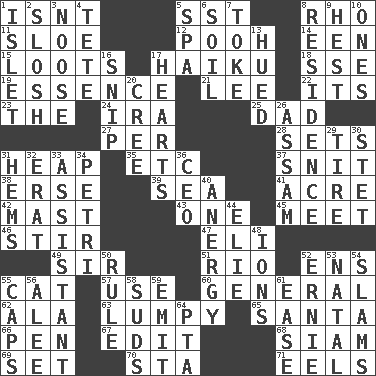 ACROSS 1. Is not 5. Fast jet (abbr.) 8. 17th letter of the Greek alphabet 11. A type of plum 12. "Silly old bear" 14. Car or cant ending 15. Plunders 17. Japanese poetic form 18. Compass dir. 19. Gist 21. Area sheltered from the wind 22. It is 23. Definite Article 24. Retirement account (abbr.) 25. Male parent 27. For each 28. Puts into a specified state 31. Pile 35. And so on (abbr.) 37. In a ____ (agitated or irritated) 38. Celtic language 39. Ocean 41. 43,560 square feet 42. Vertical spar for supporting sails 43. Single 45. Rendezvous 46. Agitate 47. Connecticut Ivy Leaguer 49. Title for a knight 51. River (Sp.) 52. Followers of ems 55. Domesticated feline 57. Purpose 60. Commissioned military rank 62. In the manner of 63. Containing lumps 65. Before Barbara or Clara 66. Animal enclosure 67. Prepare for publication 68. Thailand, formerly 69. Arrange properly for use 70. R.R. building 71. Snakelike fish DOWN 1. Small island 2. Splash clumsily 3. Trap for birds or small mammals 4. Wig 5. Health resort 6. The visible part of the earth's surface 7. Puff or smoke 8. Home 9. Behest 10. Washington bills 13. Took on color 16. Sever or remove by pinching or nipping 17. Centers 20. Algonquian 26. Indian state 29. Hoop that covers a wheel 30. Proofreading order 31. Folds over and sews together 32. Part of Q.E.F. 33. Helper 34. _ dish (used to culture cells) 36. Corporate head (abbr.) 40. Disorder of the immune system 44. Writer Wiesel 48. Charged particles 50. Court order 52. Bert's buddy 53. Relating to or accompanying birth 54. Hits or strikes with great force 55. Balmoral and tarboosh 56. Toward shelter 58. Soap bubbles 59. Send forth 61. Comfort 64. Parent Teacher Assoc.