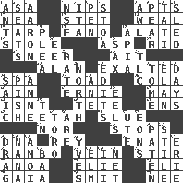 ACROSS 1. White ___ sheet 4. Pinches, bites 8. Flats, for short 12. Teachers' org. 13. Proofreading order 14. Welt 15. Canvas cover 17. Papal veil 18. Having winglike extensions 19. Fur scarf 21. Cleo's killer 23. To free from 24. Contemptuous expression 26. Small island 28. Actor Alda or Thicke 30. Glorified 34. Health resort 37. Frog relative 39. Root beer relative 40. The 18th letter of the Arabic alphabet 41. Bert's buddy 43. Can I? 44. Is not 46. Wig 47. Followers of ems 48. Leopard's kin 51. Turn sharply 54. And not 55. Ceases 58. Heredity factor (abbr.) 61. Marina Del _, California 63. Related on the mother's side 65. Role for Stallone 67. Distinctive style or manner 71. Use a spoon 72. Small Philippine buffalo 73. Writer Wiesel 74. Biblical high priest 75. Greek goddess of the earth (variant) 76. Stricken, poetically 77. Born DOWN 1. Pismires 2. Theater features 3. Composer Copland 4. Science/research agcy. 5. Call ___ day 6. Fenced enclosure 7. Portico 8. Leather borer 9. Lightbulb-shaped fruit 10. Jacques of French films 11. Downhill vehicle 16. Entreaty 18. Capital of Western Samoa 20. Snakelike fish 22. Saxophone 25. Assign a rank or rating to 27. Affectionate concern, for short 29. Compass direction 30. Proofreads 31. Heavy book 32. Liveliness 33. 24-hour periods 34. Ketch in the Levant 35. Expression of disdain 36. Queen of England 1702-14 38. A saturated hydrocarbon 42. Snakelike fish 45. "___ Little Indians" 49. "Corrida" creature 50. "We ___ not amused" (Victoria) 52. Shoshoni 53. Immeasurably long periods of time 56. Eucharist need 57. Vertical member of a panel or frame 58. To trail on the ground 59. Grandmother 60. Mine, in Marseilles 62. Jacques Cousteau's middle name 64. One of the Great Lakes 66. Sound made by sheep 68. Shade tree 69. One more than two 70. Fish or hair follower