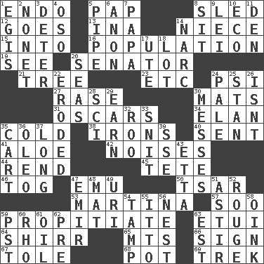 ACROSS 1. Inside; within (prefix) 5. Infant food 8. Downhill vehicle 12. Moves 13. _ tizzy (2 wds.) 14. Sibling's daughter 15. To the inside or interior of 16. Census information 19. Perceive with the eye 20. Elected representative 21. Family _ (genealogy) 23. And so on (abbr.) 24. Air pressure measure (abbr.) 27. To erase 30. Floor protectors 31. Motion picture awards 34. Liveliness 35. Lacking warmth 38. Metal shackles 40. Posted 41. _ vera 42. Annoying sounds 44. Tear apart 45. False hair 46. Coat; cloak 47. Australian flightless bird 50. Russian ruler of old 53. Chrissie's court nemesis 57. "Barney Miller" actor Jack 59. Appease 63. Needle holder 64. Bake eggs in their shells 65. Mountains (abbr.) 66. Public display of a written message 67. Lacquered or enameled metalware 68. Cooking vessel 69. Long journey DOWN 1. Armor plate that protects the chest 2. Music written for nine 3. Prevent from occurring 4. Bear (Spanish) 5. Corncob 6. At once, immediately (arch.) 7. Dad 8. Be seated 9. Luau accessory 10. Environmental prefix 11. Lair 14. Drug cop 17. Shoshoni 18. Car dealer's back yard 20. Oceans 22. Worn away 24. Diluted with white 25. Comedian Laurel of Laurel & Hardy 26. Is not 28. _-fi 29. Merit 30. Makes clutter 32. Friend of Pooh 33. In a ____ (agitated or irritated) 35. Heavy open wagon 36. Margarine 37. Having great length 39. Compass dir. 43. Singer James 47. Independent ruler or chieftain 48. Floor covering 49. RI univ. 51. Moving or stirring 52. Makeup applied to the cheeks 54. Pack (down) 55. "Tell ____ the Marines!" 56. A home for chicks 58. Pig sound 59. Pacific Standard Time (abbr.) 60. 17th letter of the Greek alphabet 61. Petroleum 62. Before (prefix) 63. Eastern Standard Time (abbr.)