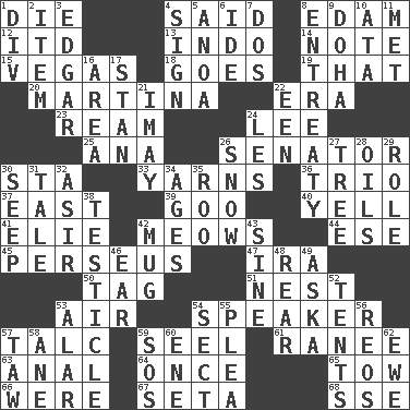 ACROSS 1. Expire 4. Expressed in words 8. Dutch treat 12. It would 13. _ china 14. Observe 15. Viva Las _ 18. Travels 19. Not this but _ 20. Chrissie's court nemesis 22. Period 23. 480, 500 or 516 sheets of paper 24. Area sheltered from the wind 25. Santa ___, CA 26. Legislator 30. R.R. building 33. Tall tales 36. Musical group of three 37. 90 degrees 39. Thick or sticky substance 40. Shout 41. Writer Wiesel 42. Catcalls? 44. Compass dir. 45. Son of Zeus who helped slay Medusa 47. Retirement account (abbr.) 50. Label 51. Egg locale 53. Wind 54. Orator 57. Baby powder 59. Stitch closed the eyes of (a falcon) 61. Indian princess (variant) 63. Of or related to the anus 64. At one time in the past 65. Pull behind 66. Past tense of be (plural) 67. Stalk of a moss capsule 68. Compass dir. DOWN 1. HTML Container Element 2. A distinct part 3. _ Allan Poe 4. Signal 5. Small Philippine buffalo 6. Binary compound 7. Two (Sp.) 8. Plea 9. Capital of the state of Qatar 10. "One Day ___ Time" 11. Was introduced to 16. Type of rug 17. Comedian Laurel of Laurel & Hardy 21. "If ____ say so..." 22. Car or cant ending 24. French article 26. Frozen precipitation 27. Woody plant 28. Petroleums 29. Hero or heavy, e.g. 30. Ooze 31. Falsehood 32. SW Saudi Arabia district 34. Eons 35. Friend of Pooh 38. One of the two male reproductive glands 42. Large cup 43. Trig term 46. Hearing organ 48. Stern 49. "____ silly question..." 52. Portable shelters 53. Having or resembling wings 54. Religious group 55. Entreaty 56. Vintage cars 57. The 23rd letter of the Hebrew alphabet 58. A saturated hydrocarbon 59. Mayday 60. Compass dir. 62. She-sheep
