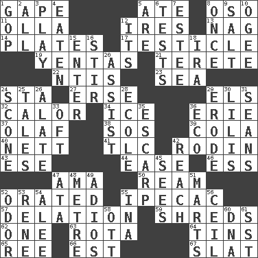 ACROSS 1. Yawn 5. Had dinner 8. Bear (Spanish) 11. Rounded earthenware pot or jar 12. Angers 13. Tired old horse 14. Food holders 17. A testis 19. Gossips 21. Cigar-shaped 22. Nuclear Threat Initiatives 23. Ocean 24. R.R. building 27. Celtic language 29. Raised railways 32. Bodily heat indicating an inflammation 34. Frozen water 36. 4th largest of the Great Lakes 37. Norwegian king 38. Distress signal 39. Root beer relative 40. Remaining after all deductions 41. Affectionate concern, for short 42. "The Thinker" sculptor 43. Compass dir. 44. Relaxation 46. Curvy letter 47. Nursemaid (var.) 50. 480, 500 or 516 sheets of paper 52. Spoke pompously 55. Medicinal drug used to evoke vomiting 57. Accusation by an informer 59. Fragments 62. Single 63. Roll call or roster of names 64. Airtight sealed metal containers 65. To riddle 66. Eastern Standard Time (abbr.) 67. Narrow board DOWN 1. Republican Party 2. 100% 3. Live dramatic performance 4. Consumed 5. "We ___ not amused" (Victoria) 6. Trials 7. First name in cosmetics 8. At one time in the past 9. Table seasoning 10. Double curve, resembling the letter S 12. ___ a Wonderful Life 15. Keyboard key 16. Agitate 18. Lyricist Gershwin 20. Help 24. Biscuitlike quick bread 25. Falsehoods 26. Having winglike extensions 28. Learning spot: Fr. 29. Eat (away) 30. Ms. Damita and namesakes 31. Seines 33. Often (poetically) 35. Fortification 36. Environmental prefix 42. Arrive at 45. Perceives with the eye 47. "One Day ___ Time" 48. Distance measurement (Brit.) 49. Goodbye (Sp.) 51. Shops 52. Scent 53. French philosopher Descartes 54. Toward shelter 55. _ tizzy (2 wds.) 56. To provide with a ceiling 58. Baseball player Mel 60. Heredity factor (abbr.) 61. Fast jet (abbr.)