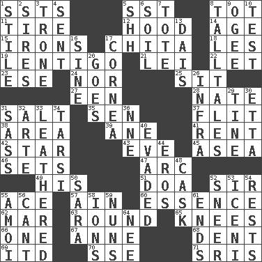 ACROSS 1. Fast planes 5. Fast jet (abbr.) 8. Small child 11. Become fatigued 12. Parka part 14. Ripen 15. Removes the wrinkles 17. Riviera of "Kiss of the Spider Woman" 18. French article 19. Small, flat, pigmented spot on the skin 21. Luau accessory 22. Allow 23. Compass dir. 24. And not 25. Be seated 27. Car or cant ending 28. Nathan's nickname 31. Table seasoning 35. Elected rep. 37. Sudden quick movement 38. Type of rug 39. One (Scot) 41. Monthly bill 42. Play the lead 43. Night before a holiday 45. Toward the sea 46. Arranges properly for use 47. Curve 49. Part of HMS, perhaps 51. ___ good deed 52. Title for a knight 55. Adept person 57. The 18th letter of the Arabic alphabet 60. Core 62. Impair 63. Single shot of ammunition 65. Leg joints 66. Single 67. Queen of England 1702-14 68. Incision 69. It would 70. Compass dir. 71. Indian titles of respect DOWN 1. Vertical member of a panel or frame 2. Titles for men of rank and authority 3. Marketplace scale 4. Posted 5. Quiet! 6. Land 7. Carryall 8. Baron Munchausen's specialties 9. Double curve, resembling the letter S 10. Trial 13. Raised platform 16. Trig term 17. Pupil covering 20. Leaves 26. Kind of red light 29. Prong on a fork 30. Singer James 31. Backtalk 32. Johnson of "Laugh-In" 33. Tough but pliablecoriaceous 34. Tarsus (plural) 36. Compass dir. 40. Eluded 44. Greek god of love 48. Keg 50. "Two Mules for Sister ____" 52. Scornful expression 53. Ancient Celtic tribe of eastern Britain 54. Musical pauses 55. Mine, in Marseilles 56. Patter 58. Charged particles 59. Religious women 61. Extremities 64. Born
