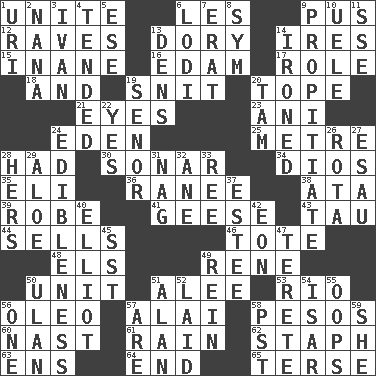 ACROSS 1. Join together 6. French article 9. Ichor 12. All-night dance parties 13. Dinghy 14. Angers 15. Empty; void 16. Dutch treat 17. Hero or heavy, e.g. 18. Plus 19. In a ____ (agitated or irritated) 20. Drink excessively 21. Sight organs 23. Cuckoo 24. Locale of original sin 25. Distance measurement (Brit.) 28. Possessed 30. Echolocation 34. "Vaya con ____" 35. Biblical high priest 36. Indian princess (variant) 38. _ moment's notice (2 wds.) 39. Loose flowing garment 41. Honkers 43. The 19th letter of the Greek alphabet 44. Makes a sale 46. Carryall 48. Raised railways 49. French philosopher Descartes 50. A single undivided whole 51. Toward shelter 53. River (Sp.) 56. Butter sub 57. Jai ____ 58. Mexican monetary units 60. Political cartoonist Thomas 61. Water falling in drops from the sky 62. Staphylococcus 63. Followers of ems 64. Conclusion 65. Laconic DOWN 1. RI univ. 2. Nanny 3. _ the terrible 4. Looked after 5. Compass dir. 6. Farming town in central California 7. Part of Q.E.F. 8. Symbol (abbr.) 9. Conciliate 10. Ubangi River tributary 11. Compass dir. 13. Hiding places for outlaws 14. Pressed 19. Sir (Sp.) 20. Scottish cap 22. Consenting reply 24. The property of being fit to eat 26. Roll call or roster of names 27. He sold his birthright 28. Possessive pronoun 29. _ vera 31. Tired old horse 32. A saturated hydrocarbon 33. Portuguese money of account (variant) 37. First name in cosmetics 40. American author Paul (1891-1958) 42. Period of immesurable duration 45. Fast jet (abbr.) 47. Cylindrical with tapered ends 49. It's straight from the horse's mouth 50. Uhlan (variant) 51. ____ Jay Lerner 52. Put down 54. Austrian river, tributary to the Danube 55. I made a mistake 56. Single 57. "We ___ not amused" (Victoria) 58. Pacific Standard Time (abbr.) 59. A female animal or person