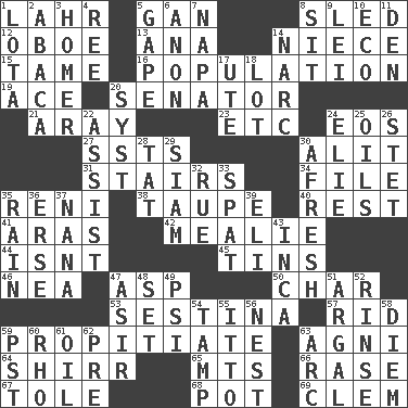 ACROSS 1. Cowardly lion portrayer 5. Separate the seeds from cotton 8. Downhill vehicle 12. Mitch Miller's instrument 13. Santa ___, CA 14. Sibling's daughter 15. Docile 16. Census information 19. Adept person 20. Elected representative 21. Like ___ of sunshine 23. And so on (abbr.) 24. Greek goddess of the dawn 27. Fast planes 30. Set down 31. Flight of steps 34. Do some clerical work 35. Painter Guido (1575-1642) 38. Grayish beige 40. Remainder 41. Caspian sea tributary 42. Ear of corn 44. Is not 45. Airtight sealed metal containers 46. Teachers' org. 47. Viper 50. Burn to charcoal 53. French poetic form 57. To free from 59. Conciliate 63. Hindu god of fire 64. Bake eggs in their shells 65. Mountains (abbr.) 66. Raze (variant) 67. Lacquered or enameled metalware 68. Plant holder 69. To starve (Brit.) DOWN 1. Globular water bottle used in Asia 2. Phillipine bananalike plant 3. Homing pigeon 4. To sift 5. Yawn 6. At once, immediately (arch.) 7. California wine valley 8. Be seated 9. Flowery wreath 10. Environmental prefix 11. Lair 14. Drug cop 17. Shoshoni 18. Car dealer's back yard 20. System (abbr.) 22. Help 24. Writer Wiesel 25. Lubricates 26. Proofreading order 28. Make lace 29. Thailand, formerly 30. Anew 32. Sorrow 33. Petty quarrel 35. Precipitation 36. Celtic language 37. Grandmother 39. Connecticut Ivy Leaguer 43. South American Indian 47. SW Saudi Arabia district 48. Arrange properly for use 49. Air pressure measure (abbr.) 51. Therefore, facetiously 52. Wash lightly 54. Pack (down) 55. "Tell ____ the Marines!" 56. A home for chicks 58. South Vietnam president (1954) 59. Pacific Standard Time (abbr.) 60. 17th letter of the Greek alphabet 61. Lubricate 62. Before (prefix) 63. Curve