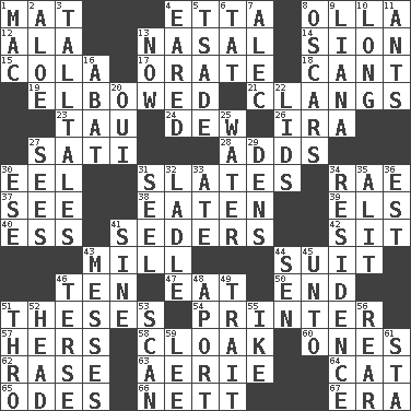 ACROSS 1. Floor protector 4. Singer James 8. Spanish pot 12. Chicken ___ king 13. Relating to the nose 14. The Jewish people; Israel 15. Root beer relative 17. Declaim 18. Patter 19. Turned at an angle; bent 21. Rings like a ship's bell 23. The 19th letter of the Greek alphabet 24. Morning condensation 26. Lyricist Gershwin 27. Suttee (variant) 28. Does sums 30. Snakelike fish 31. Chalkboards 34. Actress Charlotte 37. Perceive with the eye 38. Ingested 39. Raised railways 40. Curvy letter 41. Spring feasts 42. Be seated 43. Place where flour is made 44. Costume for a special activity 46. Nine, plus one 47. Consume 50. Conclude 51. College papers 54. Hard copy producer 57. Possessive pronoun 58. Anything that covers or conceals 60. Washington bills 62. To erase 63. Nest on high 64. Domesticated feline 65. Lyric poems 66. Remaining after all deductions 67. Epoch DOWN 1. Apple computer (short form) 2. Medicinal plant 3. Baron Munchausen's specialties 4. Having ears or earlike features 5. Sadhe (variant) 6. Make lace 7. Actor Baldwin 8. Motion picture awards 9. Climbing, woody, usually tropical vines 10. Yearn 11. Pismires 13. At this time 16. Blind as ____ 20. Fr. "Yes" 22. Hats (slang) 25. Wetness 27. Observes 29. Lairs 30. Compass dir. 31. Sew up the eyelids of hawks and falcons 32. Dipping utensil 33. Had dinner 34. Home 35. Came down and settled, as after flight 36. Eastern Standard Time (abbr.) 41. Trig term 43. Makes clutter 44. Elected rep. 45. To (old English) 46. Laconic 48. To the left, to Queeg 49. Distinguishing feature 51. Through, poetically 52. Froth on beer 53. Skim 55. D.D.E's nickname 56. Stern 59. Area sheltered from the wind 61. R.R. building