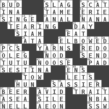 ACROSS 1. Partially opened flower 4. Volcanic refuse 8. Get outta here! 12. _ tizzy (2 wds.) 13. Docile 14. 4th largest of the Great Lakes 15. Scorch 18. Of or related to the anus 19. Grandmother 20. Pulling into pieces 22. 24 hours 23. Thailand, formerly 24. Consume 25. _ moment's notice (2 wds.) 26. Turned at an angle; bent 30. Personal Computers (abbr.) 33. Tall tales 36. Redecorate 37. Cassini of fashion 39. Allow head to fall sleepily 40. Post 41. Ballerina skirt 42. Trap for birds or small mammals 44. Writing tablet 45. French poetic form 47. Followers of ems 50. Pull behind 51. Allows 53. Attila the _ 54. More lively and spirited 57. Fermented drink made from hops 59. Enthusiastic 61. Distinguishing feature 63. At sea 64. Filth; sediment 65. Basketball assoc. 66. 1994 drama film starring Jodie Foster 67. Period of immesurable duration 68. Compass dir. DOWN 1. Twice 2. A single undivided whole 3. Natives or inhabitants of Denmark 4. Comedian Laurel of Laurel & Hardy 5. Long (Scottish) 6. Housemaid (var.) 7. Set 8. Legislators 9. Supercomputer manufacturer 10. The 18th letter of the Arabic alphabet 11. Afternoon social gathering 16. Greek goddess of the earth (variant) 17. Part of Q.E.F. 21. "If ____ say so..." 22. Pat or tap gently 24. Raised railways 26. Extremities 27. Shed a tear 28. Pulitzer Prize-winning author Ferber 29. Texas town _ City 30. Plant holders 31. A slight indication 32. Arranges properly for use 34. Small Philippine buffalo 35. Friend of Pooh 38. From the throat 42. Compass dir. 43. Snakelike fish 46. Electrically charged atom 48. Egg locale 49. Commotion 52. Seines 53. The bottom of a shoe or boot 54. Grain storage tower 55. An important port of Yemen 56. Chest bones 57. Forbid 58. Compass dir. 59. White ___ sheet 60. Compete 62. The 23rd letter of the Hebrew alphabet