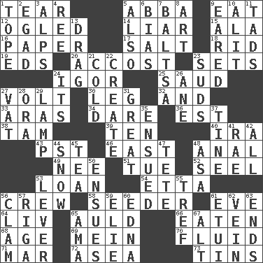 ACROSS 1. Pull apart 5. Swedish rock group 9. Ingest 12. Stared at amorously 14. One who doesn't tell the truth 15. Insect wing 16. Some stationery 17. Table seasoning 18. To free from 19. Begley and Asner 20. Buttonhole 23. Arranges properly for use 24. Russian composer Stravinsky 25. Saudi Arabian king (1953-1964) 27. Electrical Unit 30. Part of a journey 32. Also 33. Caspian sea tributary 34. Have the gumption 36. Eastern Standard Time (abbr.) 38. Scottish cap 39. Nine, plus one 40. Retirement account (abbr.) 43. Pacific Standard Time (abbr.) 46. 90 degrees 48. Of or related to the anus 49. Born 51. Third day of the wk. 52. Sew up the eyelids of hawks and falcons 53. Grant temporary use of 54. Singer James 56. Ship's personnel 58. Sowing specialist 61. Night before a holiday 64. 54 in ancient Rome 65. Old (Scot.) 66. Consumed 68. Personal question 69. Chow _ 70. Watery 71. Spoil 72. At sea 73. Metal containers DOWN 1. Drink excessively 2. Mild oath 3. High mountains 4. To riddle 5. In addition 6. Prejudice 7. Greek mezzo-soprano Agnes 8. Tate display 9. Having ears or earlike features 10. Came down and settled, as after flight 11. Bits 13. To be drawn or hauled along 21. Having a low temperature 22. Make 23. Beer foam 24. ___ a Wonderful Life 26. One (Scot) 27. Large container 28. Mouth or opening 29. Desk light 31. Relatively large 35. Took place subsequently 37. Prong on a fork 41. Actress Charlotte 42. 100% 44. Overwhelm 45. Beverage made from leaves 47. Wig 48. White ___ sheet 50. Takes place subsequently 53. Prying instrument 55. Unclean, religiously 56. Dollar (slang) 57. Port city in Latvia 59. Writer Wiesel 60. Pulitzer Prize-winning author Ferber 61. Needle case 62. Distinctive style or manner 63. Conclusions 65. Wet nurse (var.) 67. The first octave above the treble staff