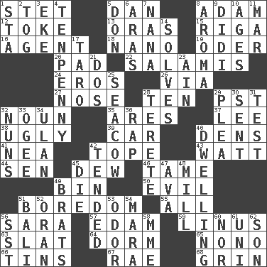 ACROSS 1. Proofreading order 5. Daniel's nick name 8. First man 12. Casino tip 13. Mouths or openings 15. Capital of Latvia 16. Representative 18. Billionth: prefix 19. River in Europe 20. Groovy apt. 22. Deli grouping 24. Greek god of love 26. By way of 27. Characteristic smell of wine 28. Nine, plus one 29. Pacific Standard Time (abbr.) 32. Part of speech 35. Ancient Greek god of war 37. Area sheltered from the wind 38. Repulsive 39. 4-wheeled motor vehicle 40. Habitations of wild animals 41. Teachers' org. 42. Drink excessively 43. Electrical Unit 44. Elected rep. 45. Morning condensation 46. Docile 49. Storage container 50. Tending to cause great harm 51. Mood resulting from idleness 55. 100% 56. "Two Mules for Sister ____" 57. Dutch treat 59. "_ and Lucy" (Charlie Brown theme song) 63. Narrow board 64. Dormintory (informal) 65. Words to Nanette 66. Airtight sealed metal containers 67. Actress Charlotte 68. Broad smile DOWN 1. R.R. building 2. Coat; cloak 3. Supplement with great effort 4. 3-inch nail 5. Spanish title 6. Caspian sea tributary 7. Grandmother 8. Scent 9. "You Light Up My Life" star Conn 10. Matures 11. Impair 14. Finds the solution 17. Edible starchy tuberous root 21. Two (Sp.) 23. The 18th letter of the Arabic alphabet 25. Manatee 28. Cigar-shaped 29. Entreaty 30. Posted 31. Trial 32. Religious women 33. Double curve, resembling the letter S 34. ____ Bator, Mongolia 36. Hit sharply and swiftly 40. Residence 42. Looked after 45. Pass on 47. Actress Gardner 48. Place where flour is made 49. Naughty children 51. Indonesian resort city 52. Northwest Algerian city 53. Aroma 54. Hindu Mythology: god of death 56. Fast jet (abbr.) 58. Madame (abbr.) 60. Not either 61. University (slang) 62. Male offspring