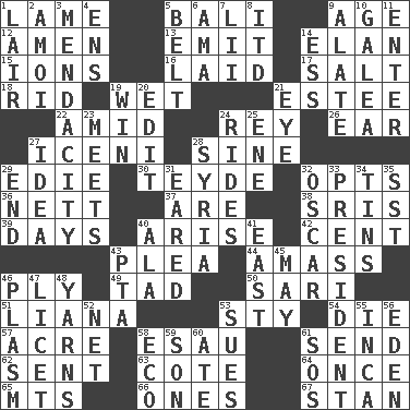 ACROSS 1. Unable to walk 5. Indonesian resort city 9. Personal question 12. So be it 13. Give off 14. Style 15. Charged particles 16. Put down 17. Table seasoning 18. To free from 19. Soggy 21. First name in cosmetics 22. Among 24. Marina Del _, California 26. Hearing organ 27. Ancient Celtic tribe of eastern Britain 28. Trig term 29. Singer Brickell 30. Miss Universe 1986, Barbara Palacios _ 32. Chooses 36. Remaining after all deductions 37. "We ___ not amused" (Victoria) 38. Indian titles of respect 39. 24-hour periods 40. Originate 42. Penny 43. Entreaty 44. Collect or gather 46. Travel a route regularly 49. Small boy 50. Indian skirt 51. Climbing, woody, usually tropical vines 53. Filthy place 54. Pass on 57. 43,560 square feet 58. He sold his birthright 61. Post 62. Posted 63. ____ d'Azur (French Riviera) 64. Single time 65. Mountains (abbr.) 66. Washington bills 67. Comedian Laurel of Laurel & Hardy DOWN 1. Den 2. Mine, in Marseilles 3. Ananias' fault 4. Followers of ems 5. Waist strap 6. Nanny (var.) 7. Cards in a Roman deck? 8. It would 9. Having winglike extensions 10. An organ shaped like a helmet 11. Keyboard key 14. Curvy letter 19. Victory 20. Prepare for publication 21. Sight organ 23. Confronts 24. Amusement-park features 25. Compass dir. 27. It may be bright or harebrained 28. Damascus' land 29. Conclude 31. Having ears or earlike features 32. Motion picture award 33. Elected leader of a country 34. Canisters 35. Fast jet (abbr.) 40. Chicken ___ king 41. Compass direction 43. Parent Teacher Assoc. 45. Fifth month 46. Suffix with ecto or cyto 47. It is permitted: Lat. 48. Tall tales 52. Fish or hair follower 53. Institutes legal proceedings 55. South American Indian 56. Locale of original sin 58. Environmental prefix 59. Male child 60. Had dinner 61. Mayday