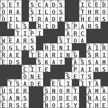 ACROSS 1. Arrange properly for use 4. Loads 9. On the rocks 13. Mouth or opening 14. Grain storage towers 15. Through, poetically 16. Lubricate 17. Swap 18. Possessive pronoun 19. Raised railways 21. To free from 22. Practice fights 24. Native american tent (variation) 26. Curve 27. Puts on (as clothing) 29. Portico 30. Stares at amorously 31. Painter Guido (1575-1642) 33. Atmosphere 36. Actress Charlotte 37. Pulling into pieces 40. Indian title of respect (Mr.) 41. Begley and Asner 42. Three-handed card game 43. Indian state 45. Quote 47. Aches 48. Single 49. Puts into a specified state 50. Sadhe (variant) 52. Connecticut Ivy Leaguer 54. Call ___ day 56. One who uses or employs something 57. Derisive sound 59. Wet nurse (var.) 61. Without 62. More peculiar 63. Tired old horse 64. Celtic language 65. Annoyingly loud 66. Definite Article DOWN 1. "Barney Miller" actor Jack 2. One of the Great Lakes 3. Baron Munchausen's specialties 4. Fast jet (abbr.) 5. High-altitude cloud 6. Jai ____ 7. Texas town _ City 8. Compass dir. 9. New York city 10. "Mermaids" star 11. Blunders 12. Two (Sp.) 20. Beget 22. Smooth fabric 23. Adept person 25. Inconspicuous attention getter 27. Had on 28. Mild oath 29. In a ____ (agitated or irritated) 31. Immoral or dissolute person 32. Epoch 33. Helper 34. SW Asia republic 35. Basketball hoops 38. First name in cosmetics 39. Yawn 44. Suttee (variant) 45. Unrefined 46. Indiana (abbr.) 49. Founders of families 50. Russian ruler of old 51. Elected reps. 52. Inside; within (prefix) 53. Farming town in central California 55. Wet nurse 56. Purpose 57. Boy, to dad 58. Attempt 60. Mature