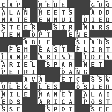ACROSS 1. Head covering 4. Ancient Persian 8. Thick or sticky substance 11. ____ Jay Lerner 13. Confronts 15. Find the sum of 16. Nathan's nickname 17. World-weariness 18. Passed on 19. Bull 21. Title for a knight 22. Armed conflicts 23. Nine, plus one 24. Choose 27. Compass dir. 29. Competent 30. Broad, flat, thick pieces 34. Opposite of masc. 36. Compass direction 39. Seductive woman who exploits men 40. Desk light 41. Get up 43. The content of cognition 44. Satellite of Uranus 46. Coast Guard woman 47. Fish or hair follower 48. _ dish (used to culture cells) 49. Mild oath, euphamism for damn 51. Actress Gardner 53. And so on (abbr.) 54. Compass dir. 57. Cassini of fashion 60. French article 63. Flexible twig of a willow tree 65. The longest river in the world 66. French painter Edouard 69. Jai _ 70. Begley and Asner 71. N. Chile seaport 72. Mail 73. Compass dir. 74. Specific locale 75. Perceive with the eye DOWN 1. 2nd pers. sing. pres. of can (arch.) 2. Having winglike extensions 3. Eucharist need 4. Madame (abbr.) 5. Car or cant ending 6. Habitations of wild animals 7. Needle case 8. Greek goddess of the earth (variant) 9. Baltic tributary 10. Probability 12. Born 14. Father 18. Home 20. Director Reiner 25. Entreaty 26. Lacerates 28. Science/research agcy. 29. Electrical Measurement 31. Helper 32. Cy Young winner Saberhagen 33. R.R. building 34. Conductor's collection 35. Give off 37. Small drink 38. Sadhe (variant) 40. Pet locale 42. Part of Q.E.F. 45. 54 in ancient Rome 50. Non-commissioned officer (abbr.) 52. _ mater 54. Grain storage towers 55. Gospel singer Marvin 56. Compose 57. Singles 58. Hats (slang) 59. Otherwise 61. Hearing organs 62. Clip 64. Plant excrement 67. Environmental prefix 68. Make lace