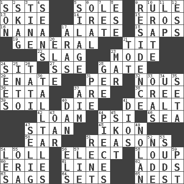ACROSS 1. Fast planes 5. Flatfish 9. Court order 13. Migrant worker of the '30s 14. Angers 15. Greek god of love 16. Nanny 17. Having winglike extensions 18. Plant excrements 19. Commissioned military rank 21. Teat (slang) 22. Volcanic refuse 23. Method 24. Be seated 27. Compass dir. 28. Yard entry 29. Related on the mother's side 31. For each 32. Common sense 36. Singer James 37. "We ___ not amused" (Victoria) 38. Algonquian 39. The visible part of the earth's surface 40. Expire 41. Started a card game 42. Rich soil 44. 23rd letter of the Greek alphabet 46. Ocean 47. Comedian Laurel of Laurel & Hardy 48. Image 50. Ewer handle 51. Thinks logically 54. Hang loosely or laxly 56. Choose 58. Central Nebraska county 60. 4th largest of the Great Lakes 61. Actor's bit 62. Sums up 63. Settles 64. Puts into a specified state 65. A home for chicks DOWN 1. Boy, to dad 2. Heroin 3. Prong on a fork 4. Actors Connery and Penn 5. Fodder prepared in a silo 6. Taken by mouth 7. Allow 8. Compass dir. 9. Home 10. A salt of uric acid 11. Trim (branches) 12. Double-curved letter 17. Ancient river in northeast Turkey 20. Otherwise 21. Small child 23. Make imperfect 24. Observes 25. To the inside or interior of 26. Jacques of French films 28. Unit of force equal to gravity 30. Baron Munchausen's specialties 31. Before (prefix) 33. Mouths or openings 34. Ubangi River tributary 35. Bristle 37. Direct toward a target or goal 40. One of the 12 tribes of Israel 41. "Vaya con ____" 43. Boat paddle 44. Components 45. Three-handed card game 47. Major League Baseball Commissioner Bud 49. Pitcher Ryan 51. Monthly bill 52. Connecting point 53. Beer foam 54. French article 55. Mouth or opening 56. Raised railways 57. Whopper 59. Pacific Standard Time (abbr.)