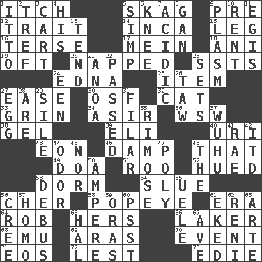 ACROSS 1. Hankering 5. Heroin 9. Before (prefix) 12. Distinguishing feature 14. South American Indian 15. Part of a journey 16. Laconic 17. Chow _ 18. Black tropical American cuckoo 19. Often (poetically) 20. Slept 23. Fast planes 24. Pulitzer Prize-winning author Ferber 25. A distinct part 27. Comfort 30. Order of Saint Francis (abbr.) 32. Feline 33. Broad smile 34. SW Saudi Arabia district 36. Compass dir. 38. Set 39. Connecticut Ivy Leaguer 40. RI univ. 43. A really long time 46. Moist 48. Not this but _ 49. ___ good deed 51. Friend of Pooh 52. Became colored 53. Dormintory (informal) 54. Change direction abruptly 56. "Mermaids" star 58. Wimpy's pal 61. Period 64. Director Reiner 65. Possessive pronoun 66. Member of a famous L.A. basketball team 68. Australian flightless bird 69. Caspian sea tributary 70. Happening 71. Greek goddess of the dawn 72. For fear that 73. Singer Brickell DOWN 1. "Tell ____ the Marines!" 2. Unclean, religiously 3. Haul 4. Part of HMS, perhaps 5. Simple or foolish person 6. Leg joint 7. Being or containing an acid 8. Separate the seeds from cotton 9. Suffix with ecto or cyto 10. Monthly bill 11. The front part of a cuirass 13. Look after 21. Small Philippine buffalo 22. Went by 23. Puts into a specified state 24. Car or cant ending 26. The 23rd letter of the Hebrew alphabet 27. Ovum 28. "We ___ not amused" (Victoria) 29. Drop; flow; fall 31. Of or pertaining to a thread or threads 35. Full of chinks, cracks, or crevices 37. Chinese city south-southwest of Nanjing 41. Actress Charlotte 42. It would 44. Scent 45. Not either 47. Many (prefix) 48. Definite Article 50. Electrical Unit 53. To get out of a bus 55. Ubangi River tributary 56. Algonquian 57. Same (prefix) 59. Mouths or openings 60. Inconspicuous attention getter 61. Made supply last 62. Painter Guido (1575-1642) 63. Johnson of "Laugh-In" 65. Actor Linden 67. "___ Maria"