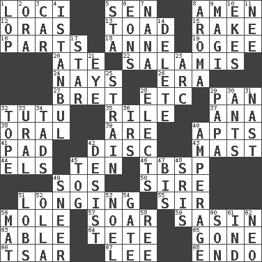 ACROSS 1. Event scenes 5. Elected rep. 8. So be it 12. Mouths or openings 13. Frog relative 15. Libertine 16. Pieces 18. Singer Murray 19. Double curve, resembling the letter S 20. Had dinner 22. Deli grouping 24. Negative votes 26. Period 27. Cy Young winner Saberhagen 28. And so on (abbr.) 29. Baking dish 32. Ballerina skirt 35. Cause heat under the collar 37. Santa ___, CA 38. Relating to the mouth 39. "We ___ not amused" (Victoria) 40. Tenement units (abbr.) 41. Writing tablet 42. Flat circle 43. Vertical spar for supporting sails 44. Raised railways 45. Nine, plus one 46. Cook's measure (abbr.) 49. Distress signal 50. Male parent of an animal 51. Yearning 55. Title for a knight 56. Undercover agent 57. Fly high 59. Indian antelope 63. Competent 64. False hair 65. Went 66. Russian ruler of old 67. Area sheltered from the wind 68. Inside; within (prefix) DOWN 1. Trim (branches) 2. Mouth or opening 3. Automobile 4. Byzantium, centuries later 5. R.R. building 6. Immeasurably long periods of time 7. Grandmother 8. Scent 9. Wise men 10. Makes supply last 11. Born 14. Erase 17. Play the lead 21. Sight organ 23. Curve 25. Put through a sieve 28. Chooses 29. Dad 30. Pismires 31. Political cartoonist Thomas 32. Drink excessively 33. Mountain range 34. Small boys 36. Big collection agency 40. Electrical Measurement 42. Stop 45. Coat; cloak 47. Altar cloth linen 48. Indian titles of respect 49. Contemptuous expression 51. Tennis shots 52. Spanish pot 53. Christmas carol 54. Yard entry 56. Floor protector 58. To separate or throw off 60. Male child 61. Working for oneself (abbr.) 62. Modern: prefix