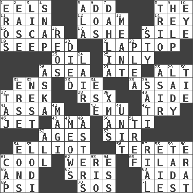 ACROSS 1. Snakelike fish 5. Find the sum of 8. Definite Article 11. Water falling in drops from the sky 12. Rich soil 14. Marina Del _, California 15. Witty Wilde 17. American tennis player Robert 18. Drop; flow; fall 19. Oozed 21. Portable computer 23. Lubricate 25. Inwardly 26. At sea 27. Had dinner 28. The first octave above the treble staff 31. Followers of ems 33. Pass on 35. Slender Brazilian palm 37. Long journey 38. Acura sports coupe 40. Assistant 41. Indian state 43. Australian flightless bird 45. Attempt 46. Type of plane 47. Nursemaid (var.) 50. Opposed to 52. Grows older 53. Title for a knight 54. American author Paul (1891-1958) 56. Cigar-shaped 61. Calm and collected 62. We are 65. Having threads 66. Also 67. Indian titles of respect 68. Opera by Verdi 69. 23rd letter of the Greek alphabet 70. Mayday 71. For fear that DOWN 1. Greek god of love 2. Relaxation 3. Louse (plural) 4. Fastener 5. Wing 6. Two (Sp.) 7. A pale violet or amethyst color 8. Musical group of three 9. Aid 10. Sight organ 13. Intended 16. Vintage cars 18. Filthy place 20. Passed on 22. Entreaty 24. Den 26. "____ silly question..." 28. SW Saudi Arabia district 29. Kenny Rogers chart-topper in '80 30. Standoff 31. Celtic language 32. Egg locale 34. Compass dir. 36. Suttee (variant) 37. _ Mahal 39. Dec. holiday 42. Wise men 44. A single undivided whole 48. Catcalls? 49. Michaelmas daisies 51. Unclean, religiously 52. 100% 54. Immeasurably long periods of time 55. Farming town in central California 57. Monetary unit of Yemen 58. Writer Wiesel 59. Small boys 60. Part of Q.E.F. 61. Head covering 63. _ de Janeiro 64. Curvy letter