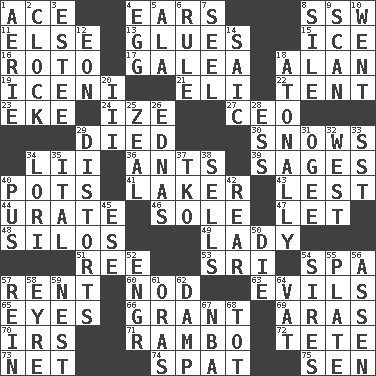 ACROSS 1. Adept person 4. Hearing organs 8. Compass dir. 11. Otherwise 13. Adhesives 15. Frozen water 16. Printing process, for short 17. An organ shaped like a helmet 18. ____ Jay Lerner 19. Ancient Celtic tribe of eastern Britain 21. Biblical high priest 22. Portable shelter 23. Make supply last 24. Ending with capital 27. Corporate head (abbr.) 29. Passed on 30. Frozen precipitation (plural) 34. Cards in a Roman deck? 36. Pismires 39. Gurus 40. Cooking vessels 41. Member of a famous L.A. basketball team 43. For fear that 44. A salt of uric acid 46. Flatfish 47. Allow 48. Grain storage towers 49. Kenny Rogers chart-topper in '80 51. Portuguese money of account (variant) 53. Indian title of respect (Mr.) 54. Health resort 57. Monthly bill 60. Lower and raise head in agreement 63. Vices 65. Snake ____ (dice throw) 66. Monetary aid 69. Caspian sea tributary 70. Big collection agency 71. Role for Stallone 72. False hair 73. Fish or hair follower 74. Argument over a trivial matter 75. Elected rep. DOWN 1. Nest on high 2. Timepiece 3. First name in cosmetics 4. Ovum 5. In the manner of 6. Governing power 7. Stitch closed the eyes of (a falcon) 8. Drop; flow; fall 9. Skim 10. Left 12. Age 14. Ketch in the Levant 18. Lacking a tonal center or key 20. One more than two 25. Ardor 26. Ferber et al. 28. Double-curved letter 29. What propaganda does 31. Double curve, resembling the letter S 32. Compass direction 33. Fast jet (abbr.) 34. Australian parrot (variant) 35. Slanted text style (abbr.) 37. Ring climax 38. Makes a sale 40. Purulenc 42. Buttocks 45. Compass dir. 50. Expire 52. Engineer (abbr.) 54. Founders of families 55. Food holder 56. NE Netherlands city 57. It's straight from the horse's mouth 58. Jane of fiction 59. A home for chicks 61. Mouths or openings 62. Moist 64. Large container 67. Basketball assoc. 68. Small child