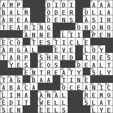 ACROSS 1. Electrical Unit 4. "You Light Up My Life" star Conn 8. American Automobile Association (abbr.) 11. Lip ointment 13. River in Europe 14. Water jar 15. Type of rug 16. Habitations of wild animals 17. SW Saudi Arabia district 18. Pulling apart 21. U. of Maine site 22. Singer Murray 23. Cards in a Roman deck? 25. Writing instrument 26. Environmental prefix 29. A testis 32. Therefore, facetiously 34. First lady 35. Myrna of the movies 38. Canvas cover 39. Fragment 41. Angers 43. Affirmative reply 44. Greek goddess of the dawn 45. Started a card game 46. Plea 50. Insidious 51. Label 54. Sound made by sheep 55. Prong on a fork 57. Phillipine bananalike plant 59. Pertaining to the sea 63. Pale green bean 64. Of or related to the anus 67. San ____ (Riviera town) 68. Prepare for publication 69. Not ill 70. Narrow board 71. Elected rep. 72. Snakelike fish 73. Potassium hydroxide DOWN 1. Blind as ____ 2. Female horse 3. Entreaty 4. Evades 5. Binary compound 6. Lair 7. Big collection agency 8. Columnist Joseph or Stewart 9. Place in a line 10. Composer Copland 12. Hindu Mythology: god of death 14. Rowing implement 19. International (abbr.) 20. Compass dir. 21. Lubricate 23. Moving, as bait 24. On the rocks 26. Ingest 27. Supercomputer manufacturer 28. Legendary monster 30. Laconic 31. Writer Wiesel 33. Domed church section 36. Mouths or openings 37. Shout 39. Bristle 40. Israeli folk dance 42. Filthy place 45. Unit of force 47. Basketball assoc. 48. Ringlike coral islands and reefs 49. Nervous spasm 51. Lies 52. Remain 53. Street urchin 56. Hearing organs 58. Feline 60. 1994 drama film starring Jodie Foster 61. "If ____ say so..." 62. ____ d'Azur (French Riviera) 64. Deep reverence 65. Born 66. Everything