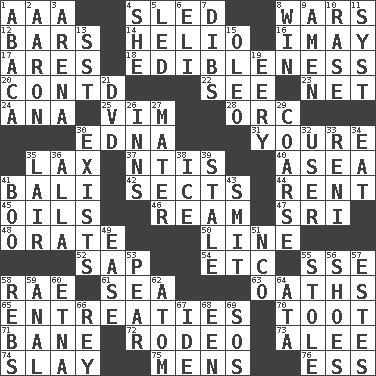 ACROSS 1. American Automobile Association (abbr.) 4. Downhill vehicle 8. Armed conflicts 12. Long, evenly shaped pieces 14. Sun: prefix 16. "If ____ say so..." 17. Ancient Greek god of war 18. The property of being fit to eat 20. Continued (abbr.) 22. Observe 23. Fish or hair follower 24. Santa ___, CA 25. Zeal 28. The grampus (Milton) 30. Pulitzer Prize-winning author Ferber 31. You are 35. Not strict 37. Nuclear Threat Initiatives 40. At sea 41. Indonesian resort city 42. Religious groups 44. Monthly bill 45. Petroleums 46. 480, 500 or 516 sheets of paper 47. Indian title of respect (Mr.) 48. Speak pompously 50. Actor's bit 52. Plant excrement 54. And so on (abbr.) 55. Compass dir. 58. Actress Charlotte 61. Ocean 63. Curses 65. Pleas 70. A blast of a horn 71. Object of repulsion 72. Cowboy competition 73. Toward shelter 74. Kill 75. Not women's 76. Curvy letter DOWN 1. Phillipine bananalike plant 2. Composer Copland 3. Sports stadium 4. A female animal or person 5. Directed 6. Connecticut Ivy Leaguer 7. Rights 8. Victory 9. So be it 10. To erase 11. System (abbr.) 13. Fast jet (abbr.) 15. Margarine 19. Suggestive of the supernatural 21. Movie disc 26. Taverns 27. Mother 29. Rough 30. Has an existence 32. One who uses or employs something 33. Painter Guido (1575-1642) 34. Consume 35. Den 36. Silent film actress Nazimova 38. Frozen water 39. Having lost freshness 41. Oct. 31 cry 43. Stricken, poetically 49. Comfort 51. Non-commissioned officer (abbr.) 53. Lightbulb-shaped fruit 55. Fur scarf 56. Imelda's hoard 57. _____ Park, CO 58. Confederate soldiers (slang) 59. Of or related to the anus 60. Inactive volcano in Sicily 62. Smallest unit of an element 64. _ moment's notice (2 wds.) 66. Marina Del _, California 67. Binary compound 68. Car or cant ending 69. Mayday
