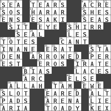 ACROSS 1. Ocean 4. Lacerates 9. Land measure 13. Mayday 14. Ethiopian city, capital of Harari 15. "______ My Girl" (Turtles hit) 16. Followers of ems 17. 1973 Nobel Price Winner (Physics) Leo 18. Oceans 19. Be seated 21. Sight organ 22. Bake eggs in their shells 24. Lick closed 26. French article 27. Lugs 29. Patter 30. Lacking in sense or substance 31. Part of Q.E.F. 33. R.R. building 36. Lair 37. Moved like an arrow 40. For each 41. Eastern Standard Time (abbr.) 42. Greek god of love 43. Feeling or showing extreme anger 45. Prejudice 47. Shoestrings 48. Curve 49. Otherwise 50. Assad's deity 52. Scottish cap 54. She-sheep 56. Narrow, elongated depression 57. Having ears or earlike features 59. Keyboard modifier key 61. Writing tablets 62. Sports stadium 63. Whopper 64. Roberta Peters solo 65. Sycophant 66. Dry husk or covering DOWN 1. Compass dir. 2. Immeasurably long periods of time 3. Aide 4. Definite Article 5. Artist's stand 6. Like ___ of sunshine 7. Libertine 8. Indian title of respect (Mr.) 9. Help 10. "Mermaids" star 11. Hitchcock's "____ Window" 12. Double-curved letter 20. Adolescent 22. Schedule 23. Layer 25. Toward the sea 27. Event that recurs at intervals 28. Washington bills 29. Crow sounds 31. Blunders 32. Friend of Pooh 33. High altitude stroll 34. Wig 35. Ancient Greek god of war 38. Arrive at 39. Deli pickle 44. To erase 45. Greek mezzo-soprano Agnes 46. Lyricist Gershwin 49. Make improvements or corrections to 50. Having or resembling wings 51. Farming town in central California 52. Edible starchy tuberous root 53. Type of rug 55. Writer Wiesel 56. Health resort 57. Erode 58. 24 hours 60. John Ritter's dad