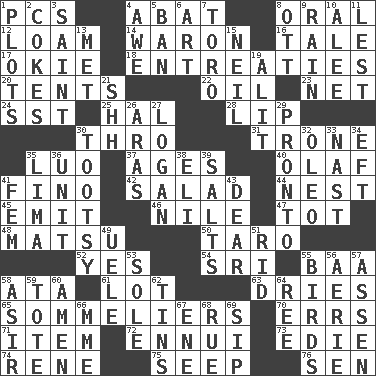 ACROSS 1. Personal Computers (abbr.) 4. Blind as ____ 8. Relating to the mouth 12. Rich soil 14. Make _____ (do battle with) 16. Lie 17. Migrant worker of the '30s 18. Pleas 20. Portable shelters 22. Petroleum 23. Fish or hair follower 24. Fast jet (abbr.) 25. Actor Linden 28. Mouth edge 30. Through, poetically 31. Marketplace scale 35. Nilotic language 37. Eras 40. Norwegian king 41. Fine (Spanish) 42. Vegetable dish 44. A home for chicks 45. Give off 46. "Death on the ____" 47. Small child 48. Taiwanese island in East China Sea 50. Pacific island yam 52. It is so 54. _ Lanka 55. Sound made by sheep 58. "One Day ___ Time" 61. Car dealer's back yard 63. Frees from moisture 65. Wine waiters 70. Blunders 71. A distinct part 72. World-weariness 73. Singer Brickell 74. French philosopher Descartes 75. Ooze 76. Elected rep. DOWN 1. Schemes 2. Popular sodas 3. Inhabitant of Heaven 4. Deep reverence 5. Bar 6. Nonscientific branch of learning 7. "Corrida" creature 8. Baseball player Mel 9. Water falling in drops from the sky 10. Toward shelter 11. For fear that 13. Was introduced to 15. Famous astronaut Armstrong 19. Set down 21. Quiet! 26. Ancient river in northeast Turkey 27. Utah city north of Ogden 29. Right away 30. Tootsie (variant) 32. Margarine 33. Political cartoonist Thomas 34. Lizard (obsolete) 35. Pale green bean 36. A single undivided whole 38. Connecticut Ivy Leaguer 39. Table seasonings 41. Opposite of masc. 43. Letter starter 49. Ubangi River tributary 51. To free from 53. Flatfish 55. Avian creatures 56. Nest on high 57. NE Netherlands city 58. SW Saudi Arabia district 59. Haul 60. So be it 62. Canisters 64. To sift 66. Madame (abbr.) 67. Compass dir. 68. Sorrow 69. Small drink