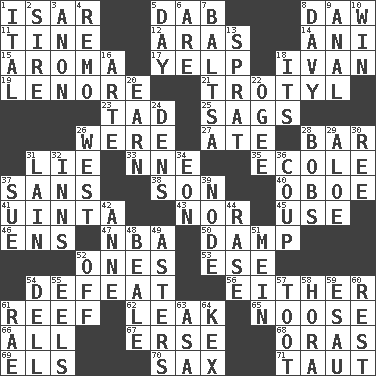 ACROSS 1. Austrian river, tributary to the Danube 5. Small moist lump or mass 8. Simpleton 11. Prong on a fork 12. Caspian sea tributary 14. Cuckoo 15. Odor 17. Sharp bark 18. _ the terrible 19. Poe poem 21. Trinitrotoluene 23. Small amount or degree 25. Sinks 26. Past tense of be (plural) 27. Had dinner 28. Long, evenly shaped piece 31. Untruth 33. Compass dir. 35. Learning spot: Fr. 37. Without 38. Male child 40. Mitch Miller's instrument 41. National forest in Provo, Utah 43. And not 45. Purpose 46. Followers of ems 47. Basketball assoc. 50. Moist 52. Washington bills 53. Compass dir. 54. Outscore 56. One or the other 61. Coral ridge 62. Path through which fluid escapes 65. Trap for birds or small mammals 66. Everything 67. Celtic language 68. Mouths or openings 69. Raised railways 70. Saxophone 71. Drawn tight DOWN 1. Slanted text style (abbr.) 2. Title for a man of rank and authority 3. Soon (poet.) 4. San ____ (Riviera town) 5. 24 hours 6. "We ___ not amused" (Victoria) 7. Greek mezzo-soprano Agnes 8. American folk hero Crockett 9. Of or related to the anus 10. Acquire through effort 13. Small fatty European fish 16. Johnson of "Laugh-In" 18. It is 20. Merit 22. Double curve, resembling the letter S 24. Habitations of wild animals 26. Compass direction 28. Moves up and down 29. Medicinal plant 30. To separate or throw off 31. (Had) reclined 32. Taverns 34. A really long time 36. Clever action or accomplishment 37. Institute legal proceedings 39. Connecting point 42. Queen of England 1702-14 44. To erase 48. Calif. Air Force Base 49. Michaelmas daisies 51. Count _ (2 wds.) 52. Not in operation 54. Small valley 55. Snakelike fish 57. A blast of a horn 58. Israeli folk dance 59. He sold his birthright 60. Relief 61. Actress Charlotte 63. White ___ sheet 64. Dry husk or covering