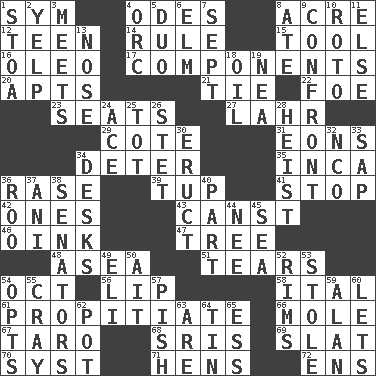 ACROSS 1. Symbol (abbr.) 4. Lyric poems 8. 1/640 square mile 12. Adolescent 14. General guideline 15. Instrument 16. Butter sub 17. Pieces 20. Tenement units (abbr.) 21. Make a knot 22. Enemy 23. Theater features 27. Cowardly lion portrayer 29. ____ d'Azur (French Riviera) 31. Immeasurably long periods of time 34. Prevent from occurring 35. South American Indian 36. To erase 39. Uncastrated adult male sheep 41. Obstruct or block passage 42. Singles 43. 2nd pers. sing. pres. of can (arch.) 46. Pig sound 47. Family _ (genealogy) 48. Toward the sea 51. Pulls apart 54. Sep. follower 56. Mouth edge 58. Slanted text style (abbr.) 61. Appease 66. Undercover agent 67. Edible starchy tuberous root 68. Indian titles of respect 69. Narrow board 70. System (abbr.) 71. Coop moms 72. Followers of ems DOWN 1. Portico 2. Sharp bark 3. Confronts 4. The grampus (Milton) 5. Superhero pair 6. Shade tree 7. Back-to-school mo. 8. Had dinner 9. Meet 10. Printing process, for short 11. Otherwise 13. Sense of smell 18. Lubricate 19. Teachers' org. 24. Adept person 25. Small child 26. Proofreading order 28. Robbery 30. Spew [out] 32. Non-commissioned officer (abbr.) 33. Plant excrement 34. Writing tables 36. Friend of Pooh 37. Cuckoo 38. Legislators 40. Role in a play 44. Born 45. Ocean 49. Biblical high priest 50. Small island 52. Basketball hoops 53. Fur scarf 54. Elects 55. Supercomputer manufacturer 57. Expression of disdain 59. Actor Alda or Thicke 60. Allows 62. Plant holder 63. "We ___ not amused" (Victoria) 64. Metal container 65. Curvy letter
