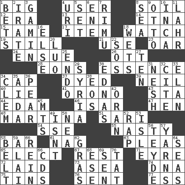 ACROSS 1. Massive 4. One who uses or employs something 8. Land 12. Epoch 13. Painter Guido (1575-1642) 14. Inactive volcano in Sicily 15. Docile 17. A whole individual unit 18. Timepiece 19. Not moving 21. Purpose 23. Rowing implement 24. Take place subsequently 26. Baseball player Mel 28. Immeasurably long periods of time 30. Core 34. Head covering 37. Colored 39. Famous astronaut Armstrong 40. Whopper 41. U. of Maine site 43. R.R. building 44. Dutch treat 46. Austrian river, tributary to the Danube 47. Layer 48. Chrissie's court nemesis 51. Indian skirt 54. Compass dir. 55. Offensive 58. Drinking establishment 61. Tired old horse 63. Entreaties 65. Choose 67. Relief 71. Jane of fiction 72. Put down 73. At sea 74. Heredity factor (abbr.) 75. Metal containers 76. Transmitted 77. Double-curved letter DOWN 1. Wagers 2. Feeling or showing extreme anger 3. Homeless child 4. RI univ. 5. Put into a specified state 6. Compass dir. 7. Tall New Zealand timber tree 8. Ocean 9. Von Bismarck 10. South American Indian 11. Cowardly lion portrayer 16. Otherwise 18. Soaks 20. Nilotic language 22. Distress signal 25. Inside; within (prefix) 27. "___ Little Indians" 29. Damascus' land 30. Ferber et al. 31. Tender 32. Quote 33. Liveliness 34. Clement's nick name 35. Opera by Verdi 36. Lightbulb-shaped fruit 38. Greek goddess of the dawn 42. Northwest Algerian city 45. Mountains (abbr.) 49. Is not 50. Teachers' org. 52. Strike 53. Capri or Wright 56. Miss Universe 1986, Barbara Palacios _ 57. Entertaining tales 58. Waist strap 59. Jai ____ 60. It's straight from the horse's mouth 62. Pate de foie ____ 64. Oceans 66. Music discs 68. Compass dir. 69. Elected rep. 70. Make lace