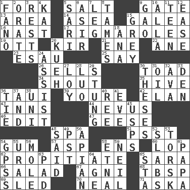 ACROSS 1. Tined utensil 5. Table seasoning 9. Yard entry 13. Length times width 14. At sea 15. An organ shaped like a helmet 16. Political cartoonist Thomas 17. Frustrating wastes of time 19. Baseball player Mel 20. Apertif with cassis 21. Compass dir. 22. One (Scot) 23. Son of Isaac 25. Declare 26. Exchanges for money 30. Frog relative 34. Yell 35. Hub of activity 36. "Change" in Tahitian 39. You are 42. Flair 43. Restaurants 44. Congenital growth or mark on the skin 46. Prepare for publication 47. Honkers 48. Health resort 51. Inconspicuous attention getter 54. Chewing product 57. Cleo's killer 58. Followers of ems 60. Trim (branches) 62. Conciliate 65. "Two Mules for Sister ____" 66. Vegetable dish 67. Hindu god of fire 68. Cook's measure (abbr.) 69. Downhill vehicle 70. Anneal 71. "____ silly question..." DOWN 1. Papal veil 2. Speak pompously 3. Musical pauses 4. Krazy ___ of comics 5. Indian skirt 6. SW Saudi Arabia district 7. Part of a journey 8. Softens 9. E Mali city 10. Silent film actress Nazimova 11. Adolescent 12. Comfort 15. Jennifer or Joel 18. Santa ___, CA 20. Malaysian steamed pastry 24. Aid 27. Myrna of the movies 28. Nilotic language 29. Feeling sharp psychological pain 30. College papers 31. Petroleum 32. Actress Gardner 33. Lair 36. Neckwear 37. Also 38. Corn or form start 40. Portuguese money of account (variant) 41. First lady 45. United States Postal Service (abbr.) 48. Stated 49. Pacific Standard Time (abbr.) 50. Bee-related 52. Broad, flat, thick pieces 53. Cod relative 54. Global Positioning Systems (abbr.) 55. Mountain range 56. Undercover agent 58. Inactive volcano in Sicily 59. Famous astronaut Armstrong 61. Dad 63. Groovy apt. 64. Grow older 65. R.R. building