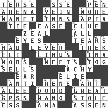 ACROSS 1. Laconic 6. Compass dir. 9. Writing instrument 12. Sports stadium 13. Distinctive style or manner 14. Had on 15. French painter Edouard 16. Lodging establishments 17. Capital of Western Samoa 18. Standoff 19. Relaxation 20. A slight indication 21. Ardor 23. 100% 24. Snake ____ (dice throw) 25. Rends 28. Possessed 30. Crowbar 34. Long journey 35. Connecticut Ivy Leaguer 36. "_ and Lucy" (Charlie Brown theme song) 38. _ tizzy (2 wds.) 39. Disorderly crowds 41. Confronts 43. Coat; cloak 44. Exchanges for money 46. Painful 48. Hearing organ 49. Writer Wiesel 50. Against 51. French philosopher Descartes 53. Nonscientific branch of learning 56. Toward shelter 57. Texas town _ City 58. Relatively large 60. Global Positioning Systems (abbr.) 61. Billionth: prefix 62. Fur scarf 63. Double-curved letter 64. Nursemaid (var.) 65. NE Netherlands city DOWN 1. Scottish cap 2. Part of Q.E.F. 3. Painter Guido (1575-1642) 4. Dwarf with a sinus problem 5. Ingest 6. Elected reps. 7. Trig term 8. Followers of ems 9. Teen's desire 10. 4th largest of the Great Lakes 11. Teachers' org. 13. Small bottle 14. Place for singles 19. Artist's stand 20. Feline 22. Snakelike fish 24. The property of being fit to eat 26. Former U.S. Attorney General Janet 27. Heroin 28. Is hesitant and indecisive 29. _ vera 31. Zeal 32. Compass dir. 33. Regret 37. Having lost freshness 40. Chalkboards 42. _-fi 45. _ Lanka 47. Centers 49. Inside; within (prefix) 50. High mountains 51. Wander aimlessly 52. Pulitzer Prize-winning author Ferber 54. Vintage cars 55. Falsehood 56. Ripen 57. Heredity factor (abbr.) 58. Girls' org. (abbr.) 59. Nine, plus one