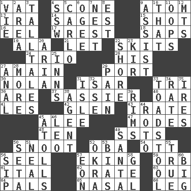 ACROSS 1. Large container 4. Biscuitlike quick bread 9. Tiny particle 13. Retirement account (abbr.) 14. Gurus 15. Guess 16. Snakelike fish 17. Take or capture by force 18. Plant excrements 19. In the manner of 21. Allow 22. Burlesque acts 24. Musical group of three 26. Part of HMS, perhaps 27. With great haste 29. Sweet dark-red dessert wine 30. Pitcher Ryan 31. Austrian river, tributary to the Danube 33. Three (prefix) 36. "We ___ not amused" (Victoria) 37. More disrespectful 40. Boat paddle 41. French article 42. Small, secluded valley 43. Feeling or showing extreme anger 45. Toward shelter 47. Methods 48. "___ Little Indians" 49. Fast planes 50. Snout, nose 52. Chief or king in Benin or Nigeria 54. Baseball player Mel 56. Stitch closed the eyes of (a falcon) 57. Supplementing with great effort 59. Globe 61. Slanted text style (abbr.) 62. Speak pompously 63. Fr. "Yes" 64. Friends 65. Rhinal 66. Part of a journey DOWN 1. Compete 2. Type of rug 3. Baron Munchausen's specialties 4. Compass dir. 5. Monte _, Las Vegas Hotel/Casino 6. Double curve, resembling the letter S 7. Egg locale 8. Eastern Standard Time (abbr.) 9. Aid 10. Not this but _ 11. I made a mistake 12. Mountains (abbr.) 20. Roberta Peters solo 22. Dinah or Pauly 23. Apertif with cassis 25. Taverns 27. Of or related to the anus 28. Greater amount 29. Ache 31. Small island 32. Compass dir. 33. Inedible or poisonous agaric 34. Assign a rank or rating to 35. Angers 38. Representative 39. Basketball hoops 44. Printing process, for short 45. Ringlike coral islands and reefs 46. Lion 49. Before Barbara or Clara 50. Stalk of a moss capsule 51. Be tempered by heat 52. Gumbo ingredient 53. Prejudice 55. Loyal 56. Small drink 57. Age 58. Set 60. Massive