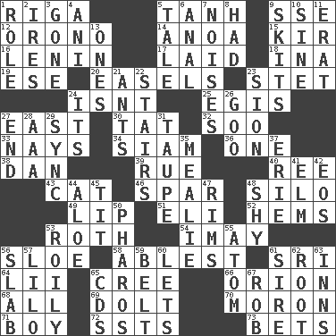 ACROSS 1. Port city in Latvia 5. Hyperbolic tangent 9. Compass dir. 12. U. of Maine site 14. Small Philippine buffalo 15. Apertif with cassis 16. Soviet premier 1918-24 17. Put down 18. _ tizzy (2 wds.) 19. Compass dir. 20. Artist's stands 23. Proofreading order 24. Is not 25. Armor plate that protects the chest 27. Compass direction 30. Make lace 32. "Barney Miller" actor Jack 33. Negative votes 34. Thailand, formerly 36. Single 38. Daniel's nick name 39. Regret 40. To separate or throw off 43. Domesticated feline 46. Coast Guard woman 48. Grain storage tower 49. Mouth edge 51. Connecticut Ivy Leaguer 52. Cloth borders 53. Writer of Portnoy's Complaint (1969) 54. "If ____ say so..." 56. A type of plum 58. Most capable 61. Indian title of respect (Mr.) 64. Cards in a Roman deck? 65. Algonquian 66. Greek mythologigal hunter 68. 100% 69. Stupid person 70. Person of subnormal intelligence 71. Male child 72. Fast planes 73. Wagers DOWN 1. Hero or heavy, e.g. 2. Angers 3. Went 4. Cuckoo 5. Falsehood 6. Of or related to the anus 7. Annoying sounds 8. Possessed 9. Burlesque acts 10. Trig term 11. Part of Q.E.F. 13. Singles 21. Pismires 22. Flight of steps 23. The Jewish people; Israel 24. It is 26. Thick or sticky substance 27. Conclude 28. American Automobile Association (abbr.) 29. Synchronize (abbr.) 31. Grayish beige 35. Ear of corn 37. 4th largest of the Great Lakes 41. Shade tree 42. Greek goddess of the dawn 44. Medicinal plant 45. Teat (slang) 47. Basketball hoops 48. Like a shrinking violet 50. N Egypt peninsula 53. Agitated, as a liquid 55. Smallest unit of an element 56. Broad, flat, thick piece 57. _ and Stitch 59. Waist strap 60. Allows 61. Title for a man of rank and authority 62. Carrot, for example 63. Taverns 65. Music discs 67. Director Reiner