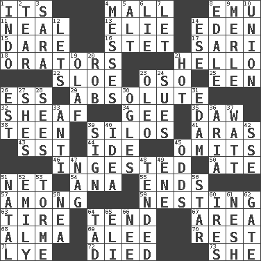ACROSS 1. It is 4. Shopping center 8. Australian flightless bird 11. Be tempered by heat 13. Writer Wiesel 14. Paradise 15. Have the gumption 16. Proofreading order 17. Indian skirt 18. Speakers 21. Phone greeting 22. _ gin 23. Bear (Spanish) 25. Car or cant ending 26. Double-curved letter 29. Utter; complete 32. Bundle of cut stalks of grain 34. Unit of force equal to gravity 35. Simpleton 38. Adolescent 39. Grain storage towers 41. Ancient river in northeast Turkey 43. Fast jet (abbr.) 44. Binary compound 45. Leaves out 46. Eaten 50. Had dinner 51. Fish or hair follower 54. Santa ___, CA 55. Extremities 57. Amid 59. Snuggling 63. Hoop that covers a wheel 64. Look after 67. Type of rug 68. _ mater 69. Toward shelter 70. Repose 71. Sodium hydroxide 72. Passed on 73. A female animal or person DOWN 1. Southeast Asian peninsula 2. Pull into pieces 3. "Two Mules for Sister ____" 4. Makes clutter 5. The first octave above the treble staff 6. Untruth 7. Allow 8. Peak District village in England 9. Haggard of country music 10. The state of being joined or united 12. Allows 14. Compass dir. 19. Norwegian king 20. Director Reiner 21. Being at a high temperature 23. Margarine 24. Institutes legal proceedings 26. Eastern Standard Time (abbr.) 27. "______ My Girl" (Turtles hit) 28. Observes 30. Stares at amorously 31. Dutch treat 33. Opposed to 36. Operatic vocal solo 37. Electrical Unit 39. Public display of a written message 40. The main thing one is thinking about 42. Compass dir. 45. Likelihood 47. Tired old horse 48. Looked after 49. Compass dir. 51. Brizilian seaport 52. Poet Dickinson 53. Singer Mel 56. Play the lead 58. Teachers' org. 60. Angers 61. Soft 62. Yard entry 64. Bit 65. Connecticut Ivy Leaguer 66. Born