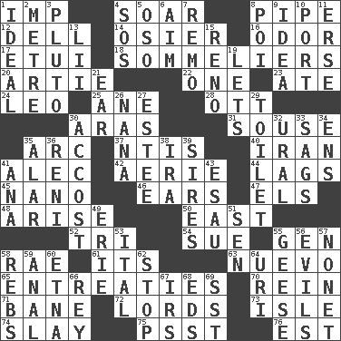 ACROSS 1. Naughty child 4. Fly high 8. Corncob 12. Small valley 14. Flexible twig of a willow tree 16. Aroma 17. Needle holder 18. Wine waiters 20. Nick name for Arthur 22. Single 23. Had dinner 24. Lion 25. One (Scot) 28. Baseball player Mel 30. Caspian sea tributary 31. Boozer 35. Curve 37. Nuclear Threat Initiatives 40. SW Asia republic 41. Actor Baldwin 42. Nest on high 44. Fails to keep up a pace 45. Billionth: prefix 46. Hearing organs 47. Raised railways 48. Originate 50. Compass direction 52. Three (prefix) 54. Institute legal proceedings 55. Commissioned military rank (abbr.) 58. Actress Charlotte 61. ___ a Wonderful Life 63. New (sp.) 65. Pleas 70. It's straight from the horse's mouth 71. Object of repulsion 72. Titled peers of a realm 73. Capri or Wright 74. Kill 75. Inconspicuous attention getter 76. Eastern Standard Time (abbr.) DOWN 1. Perfect 2. Distance measurement (Brit.) 3. Greek god of the underworld 4. Mayday 5. Bear (Spanish) 6. Direct toward a target or goal 7. San ____ (Riviera town) 8. Luau course 9. It may be bright or harebrained 10. Left side of a ship or aircraft 11. Celtic language 13. Cards in a Roman deck? 15. Western Nevada city 19. Allows 21. Ewer handle 26. Grandmother 27. First name in cosmetics 29. Bathroom 30. Buttonhole 32. Mountain range 33. Settles 34. Followers of ems 35. Having or resembling wings 36. Painter Guido (1575-1642) 38. Lyricist Gershwin 39. Titles for men of rank and authority 41. Santa ___, CA 43. Son of Isaac 49. 4th largest of the Great Lakes 51. Elected rep. 53. Slanted text style (abbr.) 55. Honkers 56. Vices 57. Music written for nine 58. Confederate soldiers (slang) 59. Of or related to the anus 60. Inactive volcano in Sicily 62. Cease 64. RI univ. 66. Marina Del _, California 67. Big collection agency 68. Begley and Asner 69. Fast jet (abbr.)