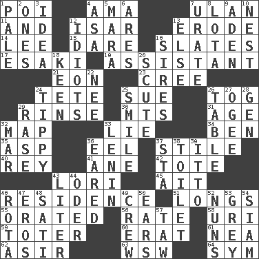 ACROSS 1. Luau course 4. Housemaid (var.) 7. ____ Bator 11. Also 12. Austrian river, tributary to the Danube 13. Eat (away) 14. Area sheltered from the wind 15. Have the gumption 16. Chalkboards 17. 1973 Nobel Price Winner (Physics) Leo 19. Helper 21. A really long time 23. Algonquian 24. False hair 25. Take to court 26. Coat; cloak 29. Wash lightly 30. Mountains (abbr.) 31. Grow older 32. Atlas unit 33. Untruth 34. Benjamin's nick name 35. Viper 36. Snakelike fish 37. Vertical member of a panel or frame 40. Marina Del _, California 41. A saturated hydrocarbon 42. Carryall 43. Australian parrot (variant) 45. Small island 46. Dwelling 51. Yearns 55. Declaimed 56. Pace 58. RI univ. 59. Carrier 60. Part of Q.E.F. 61. Teachers' org. 62. SW Saudi Arabia district 63. Compass dir. 64. Symbol (abbr.) DOWN 1. Diluted with white 2. Singles 3. The main thing one is thinking about 4. White ___ sheet 5. Hindu Mythology: god of death 6. Ancient Greek god of war 7. A salt of uric acid 8. Globular water bottle used in Asia 9. An important port of Yemen 10. Egg locale 12. Foolish or stupid persons 13. Otherwise 16. Male parents of animals 18. Peachy ____! 20. Snake scale 22. Born 24. Likely to tip or tilt 25. Grin 26. Eating place 27. Double curve, resembling the letter S 28. Commissioned mil. rank 29. To erase 32. Impair 33. Soviet premier 1918-24 36. Having ears or earlike features 37. R.R. building 38. Bathroom 39. "Tell ____ the Marines!" 43. 61 cubic inches 44. River in Europe 46. Round or rotation of duties 47. Greek god of love 48. Suttee (variant) 49. Group working together 50. Hearing organs 52. Religious women 53. Jennifer or Joel 54. Thailand, formerly 57. The 23rd letter of the Hebrew alphabet