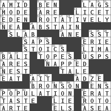 ACROSS 1. Among 5. Benjamin's nick name 8. Falls behind 12. Method 13. "We ___ not amused" (Victoria) 14. It is permitted: Lat. 15. Genesis locale 16. Producing rotation 19. Teachers' org. 20. Choose not to consume 21. Thick slice 23. A saturated hydrocarbon 24. Fast jet (abbr.) 27. Plant excrements 30. One of the Great Lakes 31. Unemotional ones 34. Pale green bean 35. Indonesian resort city 38. Drinks excessively 40. United States Postal Service (abbr.) 41. Ancient Greek god of war 42. Slept 44. Egg locale 45. Lie 46. Ingest 47. Small island 50. Axlike tool, used for shaping wood 53. "Death Wish" actor 57. Followers of ems 59. Census information 63. Part of Q.E.F. 64. Clothes sense 65. Falsehood 66. Printing process, for short 67. Johnson of "Laugh-In" 68. Raised railways 69. At sea DOWN 1. So be it 2. Methods 3. Perfect 4. Lair 5. Sharp remark 6. Greek god of love 7. Remaining after all deductions 8. 54 in ancient Rome 9. Adept person 10. Set 11. Filthy place 14. Actor's bit 17. American Automobile Association (abbr.) 18. Shallow baking pan 20. Blind as ____ 22. Help 24. Indian titles of respect 25. Simple or foolish person 26. Beverages made from leaves 28. Cooking vessel 29. The Jewish people; Israel 30. Dodged 32. Tax preparer (abbr.) 33. Back-to-school mo. 35. Object of repulsion 36. Type of rug 37. For fear that 39. Health resort 43. Style 47. Competent 48. Lyricist Gershwin 49. Small child 51. Nothings 52. Maternal 54. The longest river in the world 55. Earth 56. Washington bills 58. Portico 59. Parent Teacher Association (abbr.) 60. Rowing implement 61. Pacific Standard Time (abbr.) 62. Shoshoni 63. Period