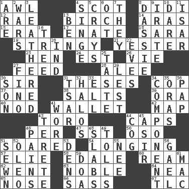 ACROSS 1. Leather borer 4. Native of Scotland 8. "You Light Up My Life" star Conn 12. Actress Charlotte 13. A tree used for making furniture 14. Ancient river in northeast Turkey 15. Part of Q.E.F. 17. Related on the mother's side 18. "Two Mules for Sister ____" 19. Slender, wiry 21. Last past 23. Layer 24. Eastern Standard Time (abbr.) 26. Compete 27. Nourish 28. Toward shelter 30. Title for a knight 31. College papers 34. Police officer (slang) 37. Single 38. Table seasonings 39. Mouth or opening 40. Dreamland 41. Place for singles 42. Atlas unit 43. "Corrida" creature 44. Smile enhancers 46. For each 47. Fast jet (abbr.) 50. Bear (Spanish) 51. Flew 54. Yearning 57. Writer Wiesel 58. Peak District village in England 60. 480, 500 or 516 sheets of paper 62. Left 63. Having high moral qualities 64. Teachers' org. 65. Sense of smell 66. Backtalk 67. Affectionate concern, for short DOWN 1. "We ___ not amused" (Victoria) 2. Armed conflicts 3. Tough but pliablecoriaceous 4. Burn superficially 5. Trading vessels 6. Sep. follower 7. Those people 8. Small ungulate mammals of Africa 9. Feeling or showing extreme anger 10. Have the gumption 11. Austrian river, tributary to the Danube 13. Benjamin's nick name 16. Woody plant 20. Working for oneself (abbr.) 22. Nights before holidays 25. Clothes sense 27. Fine (Spanish) 29. For fear that 30. Boy, to dad 31. Russian ruler of old 32. Rings 33. Pipe bend 34. Part 35. Mouths or openings 36. Infant food 41. Had on 43. Cigar-shaped 44. Gear tooth 45. SW Saudi Arabia district 46. Aches 48. Broad, flat, thick pieces 49. For Whom the Bell _____ 51. Stitched 52. Butter sub 53. Hiding places for outlaws 55. Born 56. Highlander 59. ___ good deed 61. Big _