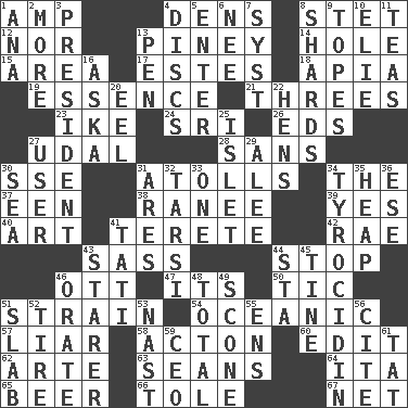 ACROSS 1. Electrical Unit 4. Hiding places for outlaws 8. Proofreading order 12. And not 13. Abounding in pines 14. Opening into or through something 15. Length times width 17. _____ Park, CO 18. Capital of Western Samoa 19. Core 21. Triads 23. D.D.E's nickname 24. Indian title of respect (Mr.) 26. Begley and Asner 27. Freehold land 28. Without 30. Compass dir. 31. Ringlike coral islands and reefs 34. Definite Article 37. Car or cant ending 38. The wife of a rajah (variant) 39. Affirmative reply 40. Nonscientific branch of learning 41. Cigar-shaped 42. Actress Charlotte 43. Backtalk 44. Cease 46. Baseball player Mel 47. It is 50. Nervous spasm 51. Put through a sieve 54. Pertaining to the sea 57. One who doesn't tell the truth 58. NE Massachussets city 60. Prepare for publication 62. Johnson of "Laugh-In" 63. Actors Connery and Penn 64. Call ___ day 65. Fermented drink made from hops 66. Lacquered or enameled metalware 67. Fish or hair follower DOWN 1. Santa ___, CA 2. Greater amount 3. Elected leader of a country 4. Plates 5. Keyboard key 6. Born 7. System (abbr.) 8. Broken pieces 9. Drinks excessively 10. Writer Wiesel 11. Beverages made from leaves 13. Fenced enclosure 16. "____ silly question..." 20. Snakelike fish 22. Coop moms 25. Small island 27. One who makes use of a thing 29. Toward shelter 30. Ocean 31. Ancient Greek god of war 32. Tarsus (plural) 33. Single 34. Polypeptide antibiotic 35. Pile 36. Compass dir. 41. Jacques of French films 43. A viewer who gazes fixedly 44. R.R. building 45. Prong on a fork 46. Declaim 48. Add up to 49. Biscuitlike quick bread 51. Broad, flat, thick piece 52. Become fatigued 53. Political cartoonist Thomas 55. Followers of ems 56. Quote 59. Corporate head (abbr.) 61. Make lace
