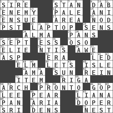 ACROSS 1. Title for a man of rank and authority 5. Comedian Laurel of Laurel & Hardy 9. Small moist lump or mass 12. Foe 14. Diluted with white 15. Black tropical American cuckoo 16. Follow as a consequence or result 17. Length times width 18. Lower and raise head in agreement 19. Pacific Standard Time (abbr.) 20. Portable computer 23. Elected reps. 24. _ mater 25. Zero-star reviews 27. Back-to-school mo. 30. Double-curved letter 32. Bear (Spanish) 33. Writer Wiesel 34. Nuclear Threat Initiatives 36. Deep reverence 38. Viper 39. Period 40. Directed 43. Shade tree 46. Allows 48. Capri or Wright 49. Nursemaid (var.) 51. Player for Phoenix 52. It's straight from the horse's mouth 53. Detail 54. Port city in Latvia 56. Bowlike part 58. Right away 61. Grand Old Party 64. Area sheltered from the wind 65. Lightbulb-shaped fruit 66. Climbing, woody, usually tropical vines 68. Baking dish 69. Roberta Peters solo 70. Drug addict 71. _ Lanka 72. Cub Scout units 73. A home for chicks DOWN 1. Ooze 2. Lodging establishments 3. Repose 4. Australian flightless bird 5. Argument over a trivial matter 6. Pacific island yam 7. City in Syria 8. Teachers' org. 9. Natives or inhabitants of Denmark 10. Soon (poet.) 11. Auction offers 13. Shout 21. So be it 22. Soft color 23. Frozen precipitation 24. Had dinner 26. White ___ sheet 27. Ocean 28. Raised railways 29. Corncob 31. Begets 35. Titan orbits this 37. Otherwise 41. Connecticut Ivy Leaguer 42. Lair 44. Thin strip of wood or metal 45. Madame (abbr.) 47. In a ____ (agitated or irritated) 48. Lyricist Gershwin 50. Electrical Unit 53. Ancient Celtic tribe of eastern Britain 55. Aureate 56. High mountains 57. Buttocks 59. Precipitation 60. Mouths or openings 61. Open wide 62. Washington bills 63. Component 65. Groovy apt. 67. Electrically charged atom