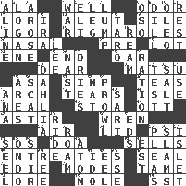 ACROSS 1. Insect wing 4. Not ill 8. Scent 12. Australian parrot (variant) 14. Eskimo relative 16. Drop; flow; fall 17. Russian composer Stravinsky 18. Complicated, petty procedures 20. Rhinal 22. Before (prefix) 23. Car dealer's back yard 24. Compass dir. 25. Conclusion 28. Rowing implement 30. Letter starter 31. Taiwanese island in East China Sea 35. White ___ sheet 37. Simple or foolish person 40. Afternoon social gatherings 41. Bowlike part 42. Pulls into pieces 44. Capri or Wright 45. Anneal 46. Portico 47. Baseball player Mel 48. Being in motion 50. Songbird 52. Atmosphere 54. Hat (slang) 55. 23rd letter of the Greek alphabet 58. Mayday 61. ___ good deed 63. Makes a sale 65. Pleas 70. Lick closed 71. Singer Brickell 72. Methods 73. Docile 74. Old wives' tales, e.g. 75. Undercover agent 76. Fast jet (abbr.) DOWN 1. Place in a line 2. Utah city north of Ogden 3. Came up 4. Armed conflict 5. Connecticut Ivy Leaguer 6. Part of a journey 7. Mass 8. Bear (Spanish) 9. Deli pickle 10. Butter sub 11. Respite 13. Retirement account (abbr.) 15. Pacific island yam 19. 480, 500 or 516 sheets of paper 21. Area sheltered from the wind 26. Political cartoonist Thomas 27. Frees from moisture 29. Food allowance for one day 30. Mexican or Central American flower 32. Trial 33. Table seasoning 34. Purpose 35. Ancient Greek god of war 36. Scram, to a cat 38. Floor protector 39. Move like a hungry wolf 41. Santa ___, CA 43. Indian skirt 49. Travel on an animal 51. Begley and Asner 53. Wander aimlessly 55. Entreaties 56. Shuts with force 57. Small island 58. Stitch closed the eyes of (a falcon) 59. Southwest Nigerian state 60. Agitate 62. Smallest unit of an element 64. Eastern Standard Time (abbr.) 66. Portuguese money of account (variant) 67. Wedding promise 68. Snakelike fish 69. Compass dir.