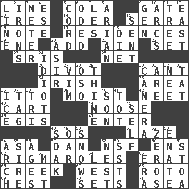 ACROSS 1. Welles in "The Third Man" 5. Root beer relative 9. Yard entry 13. Angers 14. Baltic tributary 15. Father Junipero _ 16. Observe 17. Dwellings 19. Compass dir. 20. Say or write further 21. The 18th letter of the Arabic alphabet 22. Put into a specified state 23. Indian titles of respect 25. Fish or hair follower 26. A piece of turf (Scot.) 30. Patter 34. From or relating to Ireland 35. Length times width 36. "Tell ____ the Marines!" 39. Wet 42. Rendezvous 43. Haul 44. Trap for birds or small mammals 46. The front part of a cuirass 47. Keyboard key 48. Distress signal 51. Goldbrick 54. White ___ sheet 57. One of the 12 tribes of Israel 58. Science/research agcy. 60. Followers of ems 62. Complicated, petty procedures 65. Part of Q.E.F. 66. Small stream 67. Compass direction 68. Printing process, for short 69. Command 70. Puts into a specified state 71. Toward the sea DOWN 1. Actor's bit 2. Removes the wrinkles 3. Distance measurement 4. Compass dir. 5. Drawstring 6. Wrote a lyric poem 7. French article 8. Believer in; advocate of (suffix) 9. Commissioned military rank (abbr.) 10. Curves 11. Woody plant 12. 90 degrees 15. Transmitted 18. Pass on 20. SW Saudi Arabia district 24. Foolish or stupid persons 27. Zeal 28. Bear (Spanish) 29. One or ones belonging to thee 30. Device for capturing images 31. "We ___ not amused" (Victoria) 32. Born 33. Make lace 36. Frozen water 37. Label 38. Three (prefix) 40. Manchild 41. Small child 45. Itself 48. Neighbor of Neb. 49. Boat paddle 50. Overwhelms 52. Nothings 53. Related on the mother's side 54. Bowlike part 55. The founder of a family 56. Ripens 58. Egg locale 59. Fast planes 61. Portico 63. Was introduced to 64. Area sheltered from the wind 65. Period