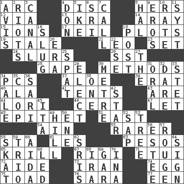 ACROSS 1. Curve 4. Compact _ 8. Possessive pronoun 12. By way of 13. Gumbo ingredient 14. Like ___ of sunshine 15. Charged particles 17. Famous astronaut Armstrong 18. Small pieces of grounds 19. Lacking originality or spontaneity 21. Lion 23. Arrange properly for use 24. Plays smoothly or legato 26. Fast jet (abbr.) 28. Yawn 30. Modes 34. Personal Computers (abbr.) 37. Medicinal plant 39. Part of Q.E.F. 40. According to 41. Portable shelters 43. "We ___ not amused" (Victoria) 44. Australian parrot (variant) 46. Foregone conclusion 47. Allow 48. Curse 51. 90 degrees 54. The 18th letter of the Arabic alphabet 55. More uncommon 58. R.R. building 61. French article 63. Mexican monetary units 65. The principal food of baleen whales 67. Swiss mountan, "Queen of the Mountains" 71. Needle case 72. Helper 73. SW Asia republic 74. Oval reproductive body of a fowl 75. Frog relative 76. "Two Mules for Sister ____" 77. Car or cant ending DOWN 1. Advice 2. Debaucheries 3. Lessep's creation 4. Spanish title 5. Mamie's mate 6. _ Lanka 7. Give a ring to 8. Actor Linden 9. Greek god of love 10. Assign a rank or rating to 11. System (abbr.) 16. Snaillike creature with no shell 18. Mail 20. Period 22. Compass dir. 25. Petty quarrel 27. Definite Article 29. Voters do this 30. Distance measurement (Brit.) 31. Taken by mouth 32. Have the gumption 33. Proofreading order 34. Light colored 35. Hoof sound 36. Indian skirt 38. Single 42. Play the lead 45. Call ___ day 49. Land elevation 50. Compass dir. 52. Plant excrement 53. Family _ (genealogy) 56. First name in cosmetics 57. Makeup applied to the cheeks 58. Three-handed card game 59. Musical group of three 60. Opera by Verdi 62. Indian titles of respect 64. Omen 66. Directed 68. Retirement account (abbr.) 69. Slender fish 70. _ tizzy (2 wds.)