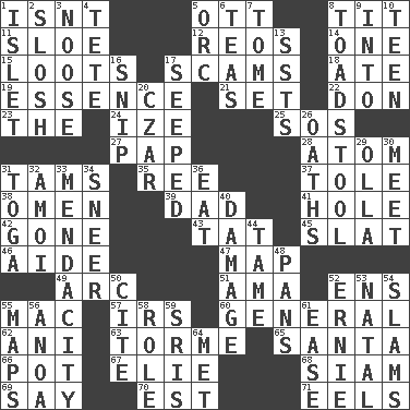 ACROSS 1. Is not 5. Baseball player Mel 8. Teat (slang) 11. A type of plum 12. Vintage cars 14. Single 15. Plunders 17. Fraudulent business schemes 18. Had dinner 19. Center 21. Arrange properly for use 22. Spanish title 23. Definite Article 24. Ending with capital 25. Mayday 27. Infant food 28. Smallest unit of an element 31. Scottish caps 35. To sift 37. Lacquered or enameled metalware 38. Presage 39. June honoree 41. Hollow 42. Went 43. Make lace 45. Narrow board 46. Assistant 47. Atlas unit 49. Curve 51. Housemaid (var.) 52. Followers of ems 55. Apple computer (short form) 57. Big collection agency 60. Commissioned military rank 62. Black tropical American cuckoo 63. Singer Mel 65. Before Barbara or Clara 66. Cooking vessel 67. Writer Wiesel 68. Thailand, formerly 69. Declare 70. Eastern Standard Time (abbr.) 71. Snakelike fish DOWN 1. Small island 2. Splash clumsily 3. Trap for birds or small mammals 4. Wig 5. The grampus (Milton) 6. Afternoon social gatherings 7. Heavy book 8. Inedible or poisonous agaric 9. To the inside or interior of 10. Adolescent 13. Fast planes 16. Clip 17. Oozed 20. Russian ruler of old 26. Curses 29. Water jar 30. Confront 31. Ancient Roman robe 32. Mine, in Marseilles 33. Ananias' fault 34. Contemptuous expression 36. Ingest 40. Break 44. Not wild 48. Baking dishes 50. Quote 52. Bert's buddy 53. Brizilian seaport 54. Hits or strikes with great force 55. Atlas contents 56. Small Philippine buffalo 58. Hero or heavy, e.g. 59. Indian titles of respect 61. Comfort 64. Was introduced to