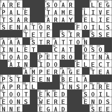 ACROSS 1. "We ___ not amused" (Victoria) 4. Fly high 8. Part of a journey 11. Diluted with white 13. Not wild 14. Not recorded 15. Russian ruler of old 16. Like ___ of sunshine 17. Writer Wiesel 18. Elected representative 21. Fencing necessities 22. False hair 23. Title for a knight 25. Compass dir. 26. American Automobile Association (abbr.) 29. Ski resort town in Vermont 32. An arm off of a larger body of water 34. Feline 35. Bear (Spanish) 38. Frog relative 39. Stone: prefix 41. Inactive volcano in Sicily 43. The 18th letter of the Arabic alphabet 44. Wedding promise 45. Voters do this 46. Electrical Measurement 50. Beverage made from leaves 51. Pacific Standard Time (abbr.) 54. Car or cant ending 55. Actor Lugosi 57. Showery time 59. Stimulate to action 63. A blast of a horn 64. Made supply last 67. The visible part of the earth's surface 68. Immeasurably long periods of time 69. We are 70. Conclusions 71. Compass dir. 72. Mild oath 73. Perceive with the eye DOWN 1. Flats, for short 2. Raze (variant) 3. Style 4. A viewer who gazes fixedly 5. Rowing implement 6. Nanny (var.) 7. Marina Del _, California 8. Ms. Damita and namesakes 9. Vices 10. Honkers 12. Part of Q.E.F. 14. Lion 19. Trial 20. Baseball player Mel 21. From 23. Play the lead 24. "Tell ____ the Marines!" 26. Small island 27. Small Philippine buffalo 28. Jai _ 30. Thespian 31. Christmas carol 33. Pulitzer Prize-winning author Ferber 36. Proofreading order 37. At one time in the past 39. Corncob 40. Genesis locale 42. _ moment's notice (2 wds.) 45. Snakelike fish 47. Cartoonist voice _ Blanc 48. Stayed 49. Commissioned military rank (abbr.) 51. Eucharist need 52. Soup utensil 53. Heavy duty weighing machine 56. Domed church section 58. It is 60. Charged atoms 61. Travel on an animal 62. Otherwise 64. She-sheep 65. Barrel 66. Epoch
