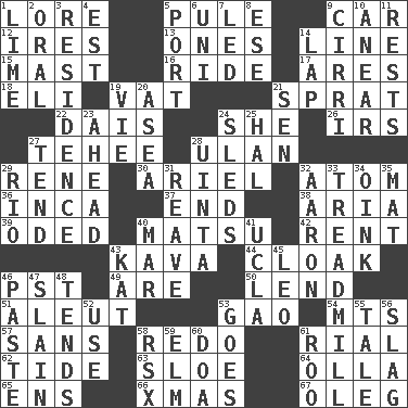 ACROSS 1. Old wives' tales, e.g. 5. Whine 9. Auto 12. Angers 13. Washington bills 14. Actor's bit 15. Vertical spar for supporting sails 16. Travel on or in a vehicle 17. Ancient Greek god of war 18. Connecticut Ivy Leaguer 19. Large container 21. Small fatty European fish 22. Raised platform 24. A female animal or person 26. Big collection agency 27. Giggle 28. Uhlan (variant) 29. French philosopher Descartes 30. Satellite of Uranus 32. Tiny particle 36. South American Indian 37. Conclusion 38. Operatic vocal solo 39. Wrote a lyric poem 40. Taiwanese island in East China Sea 42. Monthly bill 43. Polynesian shrub of the pepper family 44. Cover or conceal 46. Pacific Standard Time (abbr.) 49. "We ___ not amused" (Victoria) 50. Grant temporary use of 51. Native American of Southwest Alaska 53. E Mali city 54. Mountains (abbr.) 57. Without 58. Do over again 61. Monetary unit of Yemen 62. Periodic rise and fall of the sea level 63. _ gin 64. Rounded earthenware pot or jar 65. Followers of ems 66. Dec. holiday 67. Cassini of fashion DOWN 1. Welles in "The Third Man" 2. Spoken 3. Dwelling 4. Eastern Standard Time (abbr.) 5. Sweet dark-red dessert wine 6. University (slang) 7. Directed 8. Compass dir. 9. High-altitude cloud 10. Approach 11. Musical pauses 14. Pet locale 19. Compete 20. At sea 21. Elected rep. 23. Having the leading position 24. Bobsleighs 25. Actor Linden 27. Watch over 28. National forest in Provo, Utah 29. _ de Janeiro 31. Break or tear apart 32. Composer Copland 33. Excercise machine 34. Pig sound 35. Floor protector 40. Make imperfect 41. Southern CA. univ. 43. Krazy ___ of comics 45. Lion 46. Thick mixture 47. Killed 48. Watches over 52. Purpose 53. Travels 55. Lie 56. Volcanic refuse 58. Acura sports coupe 59. Shade tree 60. ___ good deed 61. Friend of Pooh