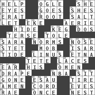 ACROSS 1. Aid 5. Stare 9. A female animal or person 12. Snake ____ (dice throw) 13. Moves 14. "______ My Girl" (Turtles hit) 15. Part of Q.E.F. 16. Carrot, for example 17. Table seasoning 18. Allow 19. Supplement with great effort 21. Nest on high 22. Flintstone garb 24. Cask 26. Two (Sp.) 27. Laconic 28. Lacquered or enameled metalware 29. "Two Mules for Sister ____" 30. Typical standards 32. Characteristic smell of wine 36. Proofreading order 37. Disorderly crowd 38. Austrian river, tributary to the Danube 39. Event that recurs at intervals 40. "_ and Lucy" (Charlie Brown theme song) 42. Inactive volcano in Sicily 43. False hair 44. Shoestrings 46. Hearing organ 49. Part of HMS, perhaps 50. Sign of things to come 51. Window treatment 53. Basketball assoc. 54. Be seated 57. Went 58. Son of Isaac 61. Hoop that covers a wheel 62. So be it 63. Drawstring 64. Nights before holidays 65. Actress Charlotte 66. Single time 67. A home for chicks DOWN 1. Person who is morally reprehensible 2. Jane of fiction 3. Resembling or made to resemble leather 4. Pacific Standard Time (abbr.) 5. Legendary monster 6. Thick or sticky substance 7. Lion 8. Eastern Standard Time (abbr.) 9. Broken piece 10. Sun: prefix 11. _____ Park, CO 14. Compass dir. 19. Begley and Asner 20. Peachy ____! 21. Mature 23. Feeling or showing extreme anger 24. Dried seaweed eaten as food 25. Raised railways 27. Jacques of French films 28. Marketplace scale 29. Fast jet (abbr.) 31. Leaves out 32. Sibling's daughter 33. Clearly or manifestly demonstrative 34. Without 35. Epoch 40. Flowery wreath 41. Messy guy 43. Definite Article 45. Nursemaid (var.) 46. _ Allan Poe 47. Scent 48. Indian princess (variant) 52. Animal enclosure 53. Naked 55. Angers 56. Trial 58. Environmental prefix 59. Manchild 60. Curve 61. Nine, plus one